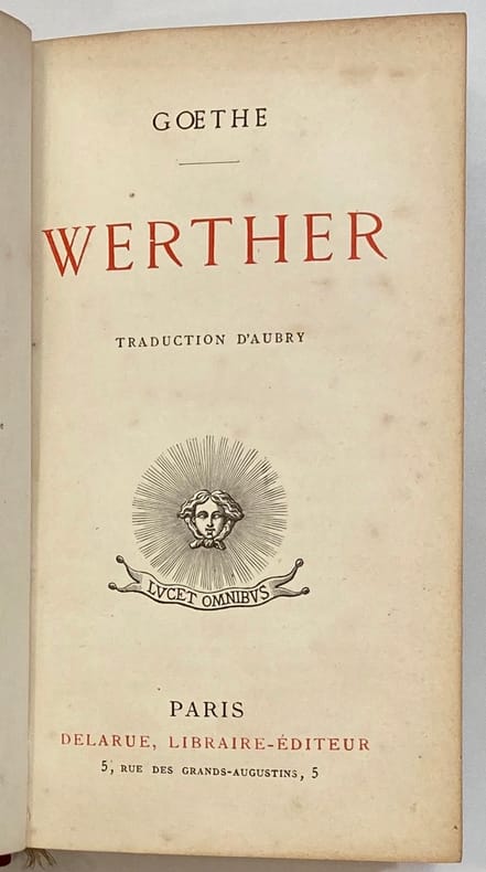 Les Souffrances du jeune Werther: la célébrité de Goethe es faite et son nom restera longtemps attaché à cet événement littéraire, au premier roman allemand qui franchit véritablement les frontières de l’Allemagne. Précieuse édition française, la première citée par Brunet, des Souffrances du jeune Werther. Goethe, Johann-Wolfgang. Werther, traduction de l’Allemand de Goethe par C. Aubry. Nouvelle Edition, revue et corrigée par le Traducteur. Avec Figures en taille-douce. Paris, de l’Imprimerie de Didot Jeune, 1797. 2 tomes en 2 volumes in-18 de: I/ x, 178 pp., 2 figures hors texte; II/ 209 pp., (6) pp. pour le catalogue de Didot, 2 figures hors texte. Veau granité, roulette dorée à la grecque sur les plats, dos lisses richement ornés, pièces de titre et de tomaison de maroquin rouge, coupes décorées, tranches dorées. Reliure de l’époque. 127 x 78 mm. Précieuse édition française, la première citée par Brunet, des Souffrances du jeune Werther. Quérard, Fr. litt., III, 395 ; Martin & Mylne 77.41 ; Cohen 442. Werther, ce roman dont l'influence fut si grande sur toutes les littératures européennes, parut à Leipzig en 1774 ; la première traduction française est, croyons-nous, celle de George Deyverdun (Maestricht, J.-E. Dufour, 1775 et 1776, 2 vol. in-12), puis vint celle de Seckendorf (Erlangen, 1776, in-8), suivie de près par celle d'Aubry qui, d'après Quérard, serait en grande partie l'œuvre du comte de Schmettau, (Mannheim et Paris, Pissot, 1777, in-8). D'autres traductions furent ensuite publiées par L.-C. de Salse (Basle, J. Decker, 1800, 2 vol. in-8), H. de La Bédoyère (Paris, Colnet, an XII, in-12), Sévelinges (Paris, Demonville, 1804, in-8), Allais (Paris, Dauthereau, 1827, 2 vol. in-32), Pierre Leroux (Paris, Charpentier, 1839, in-12), et Louis Énault (Paris, Hachette, 1855, in-12). En 1774 paraît à Leipzig le premier roman d’un auteur presque inconnu, âgé de 25 ans: Les Souffrances du jeune Werther. Cette œuvre rencontre en Allemagne un succès immédiat. Les revues discutent de la moralité ou de l’immoralité des deux petits volumes, les lecteurs se les arrachent, certains voient dans le destin de Werther un modèle à suivre. La célébrité de Johann Wolfgang Goethe est faite et son nom restera longtemps attaché à cet événement littéraire, au premier roman allemand qui franchit véritablement les frontières de l’Allemagne. Une première traduction française paraît en 1776. Lorsque, trente-deux ans plus tard, le 2 octobre 1808, Napoléon traversant l’Allemagne en conquérant se trouve à Erfurt, il demande à voir Goethe: c’est pour parler avec l’auteur de Werther, un livre qu’il a lu sept fois et qui l’a accompagné lors de sa campagne d’Egypte. «Le Werther est un défi au roman vertueux des Lumières. Mais son discours est avant tout une profession de foi subjectiviste: une quête du sens de la vie par une âme exigeante qui ne se contente plus des modes traditionnels de l’insertion sociale ni des conceptions en vigueur concernant le salut» (Dictionnaire des Œuvres). Les Souffrances du jeune Werther, premier roman de Goethe, connut un succès incroyable dès sa sortie, apportant ainsi du jour au lendemain une notoriété considérable dans toute l'Europe à son auteur. Cela déclencha ce qu'on appela alors la « fièvre werthérienne ». Mme de Staël écrira que «Werther a causé plus de suicides que la plus belle femme du monde...». Goethe lui-même déclara «L'effet de ce petit livre fut grand, monstrueux même... parce qu'il est arrivé au bon moment, mais... le suicide n'est en aucun cas une solution défendue par le livre». Le volume est orné de 4 figures de Berthon gravées par Duplessis-Bertaux. Précieux exemplaire sur papier vélin conservé dans ses élégantes reliures de l’époque aux dos lisses finement ornés.
