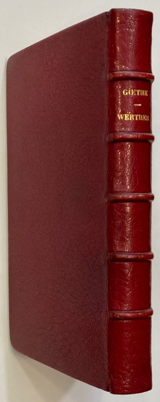 Précieuse édition française illustrée des Souffrances du jeune Werther. Paris, de l’Imprimerie de P. Didot l’Aîné, 1809. In-8 de vi pp., (1) f., 234 pp. et 3 planches hors-texte. Maroquin rouge, triple filet doré encadrant les plats, dos à nerfs richement orné, double filet or sur les coupes, roulette intérieure dorée, non rogné. Reliure signée R. Wallis binder. 217 x 134 mm.
