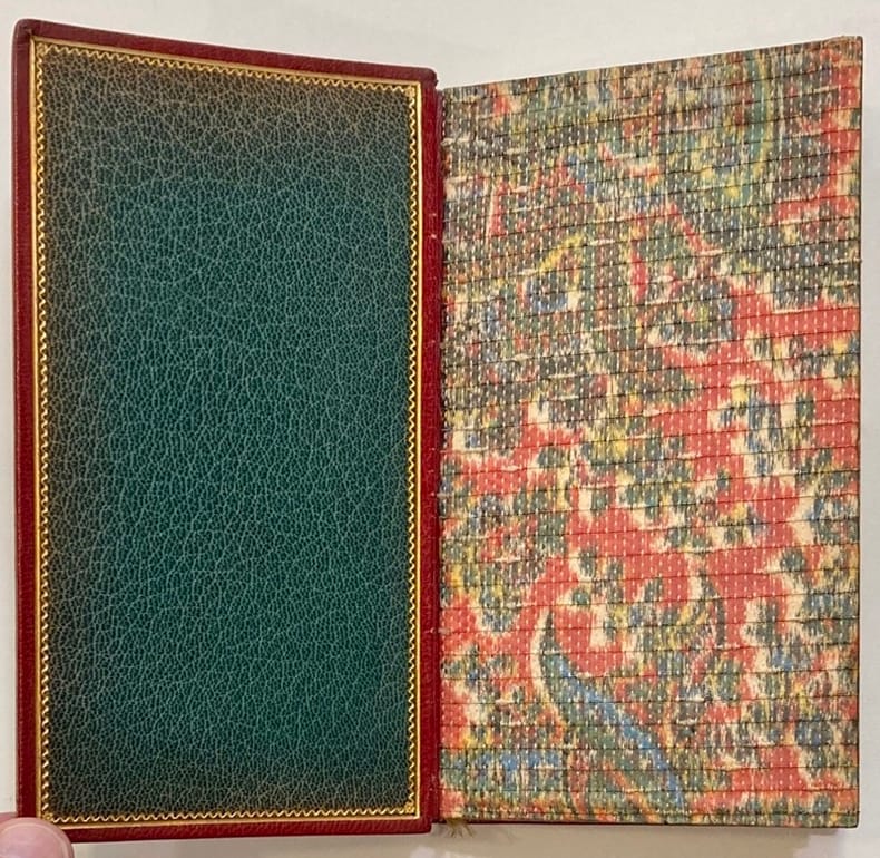 Paris. Delarue. 1 volume in-12, plein maroquin rouge janséniste, dos à nerfs, tranches dorées, doublures de maroquin vert ornées d’1 dentelle dorée en encadrement, gardes de tissu bariolé gaufré. Reliure signée « Lahaye ». (2) ff. ; 178 pp.
