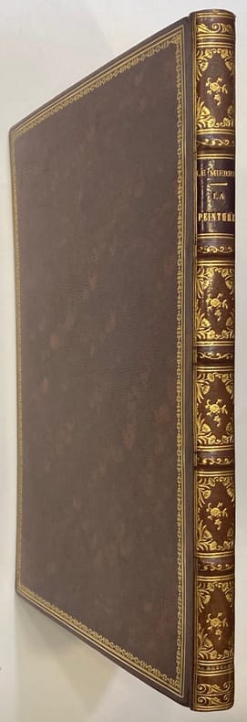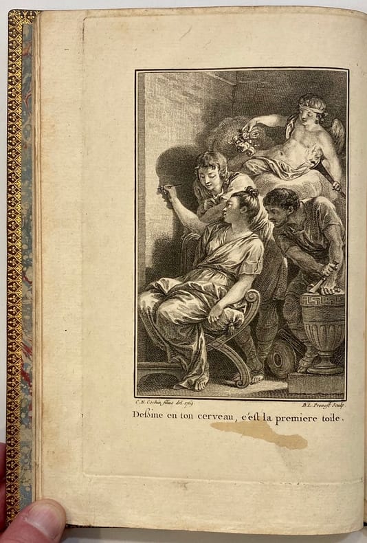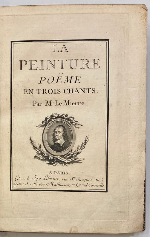 In-8 (21 x 13,5 cm), titre encadré, X + 102 pp., veau fauve moucheté, dos lisse finement orné, pièce de titre maroquin rouge, filet or sur les coupes, tranches rouges (reliure de l'époque). Edition parue la même année que l'originale, illustrée d'un portrait gravé de Corneille en médaillon, accompagné de la devise "Je dois qu'à moi seul toute ma Renommée" et trois gravures hors texte gravées par B. L. Prévost, N. Ponce, Aug. De St Aubin, d'après les dessins de C. N. Cochin fils. La page de titre et les trois gravures sont sur papier fort. Dans l'avertissement, l'auteur fait l'éloge des artistes peintres Abbé de Marsy, Léonard de Vinci, Dufresnoy, Watelet et Rubens (Coiffe supérieure arrasée, coupes frottées, première page de garde en partie détachée, brunissure en marge des premier et dernier feuillets blancs).