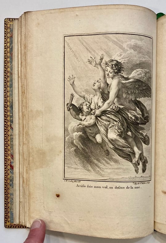 Paris, chez Le Jay, Libraire, impr. Quillau, rue de Fouarre 1769 In-8 22 x 14 cm. Reliure de l’époque veau havane marbré, dos lisses orné de fers dorés, pièce de titre maroquin rouge, plats encadrés d’un triple filet doré, contreplats encadrés de roulette dorée, tranches dorées, X-202 pp., page de titre gravée avec portrait de Corneille en médaillon, orné de trois belles figures hors-texte de Cochin, gravées par B. L. Prevost, N. Ponce et Aug. de St-Aubin. Reliure légèrement frottée, rousseurs marginales.