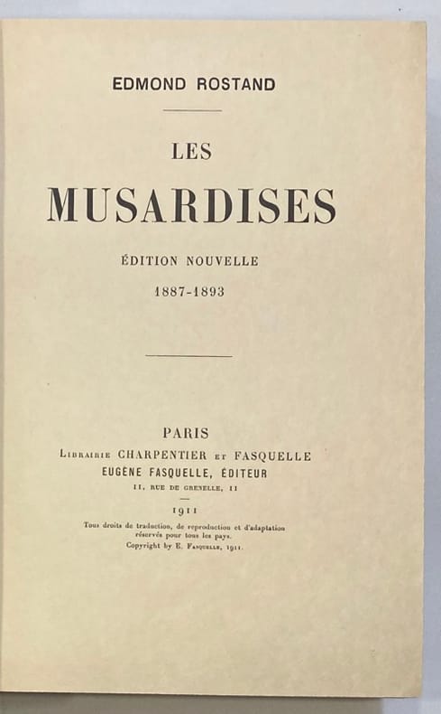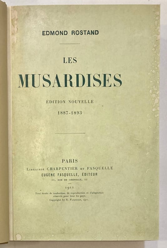 Les Musardises édition nouvelle 1887-1893 1929 + La Samaritaine évangile en trois tableaux 1905 + La Princesse lointaine pièce en quatre actes 1927 + La dernière nuit de Don Juan poème dramatique en deux parties et un prologue 1921 + Le cantique de l'aile 1926 + L'Aiglon drame en six actes en vers 1917 + Le vol de la marseillaise 1926. Classification Dewey : 840.091-XX ème siècle