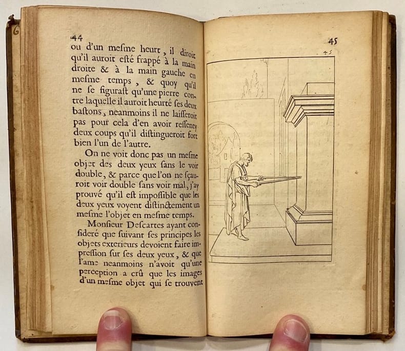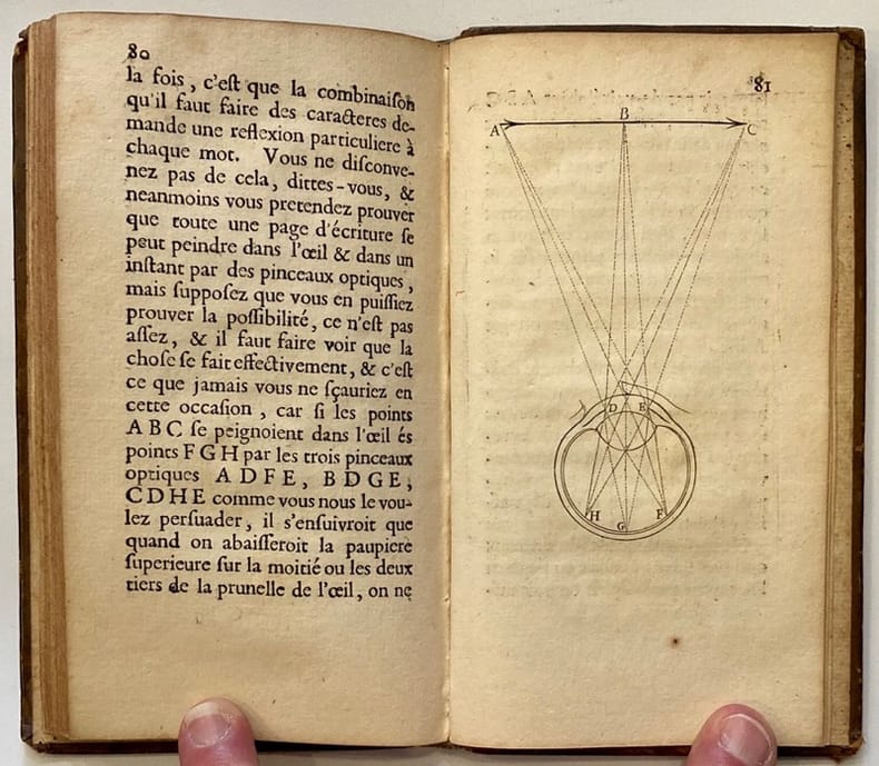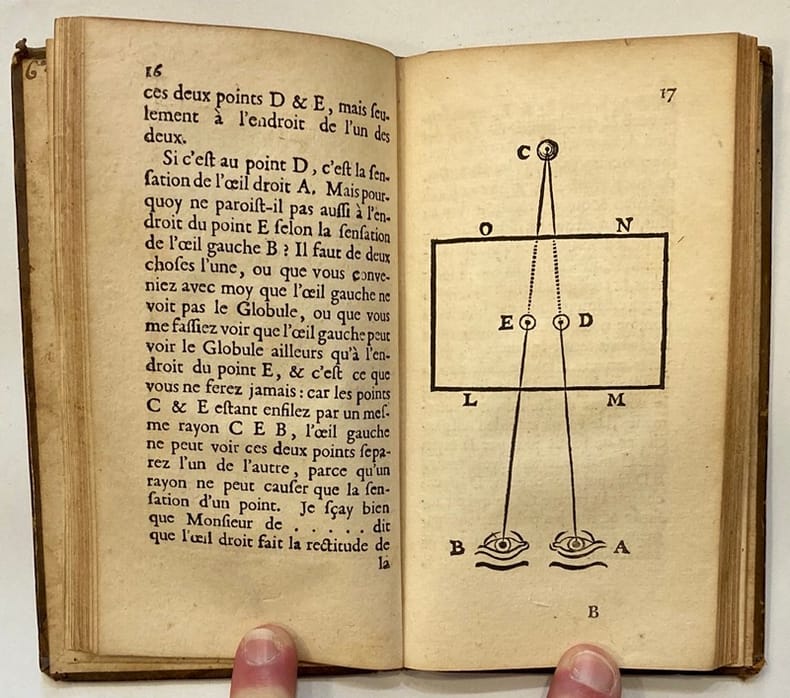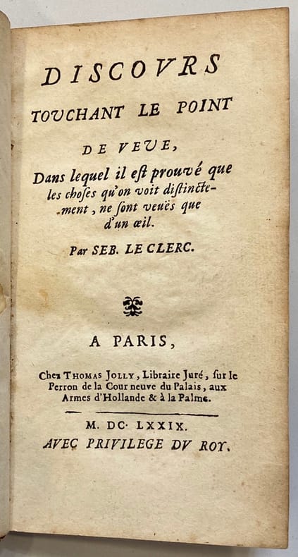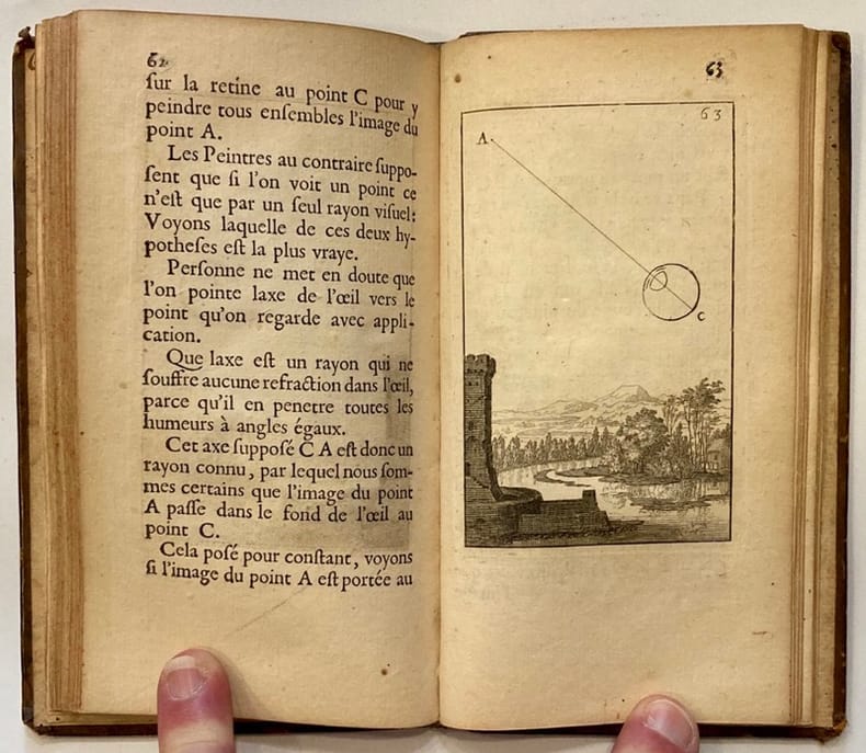 Edition originale de ce rare traité de perspective artistique et d’optique.Illustré par son auteur de 34 gravures à pleine page (9 figures géométriques sur bois et 25 figures en taille-douce), il propose une théorie nouvelle allant à l’encontre de celle sur la vision binoculaire professée jusqu’alors par Descartes en démontrant que tous les rayons visuels par lesquels on voit distinctement se réunissent dans l’oeil en un seul point.Charnières fatigués. Reliure tachée avec traces rondes à froid sur les plats.