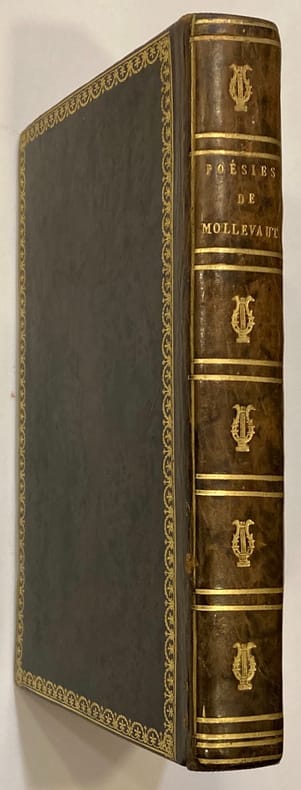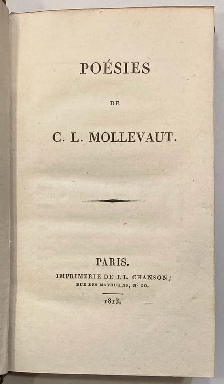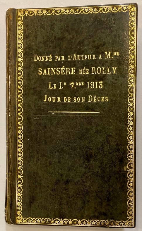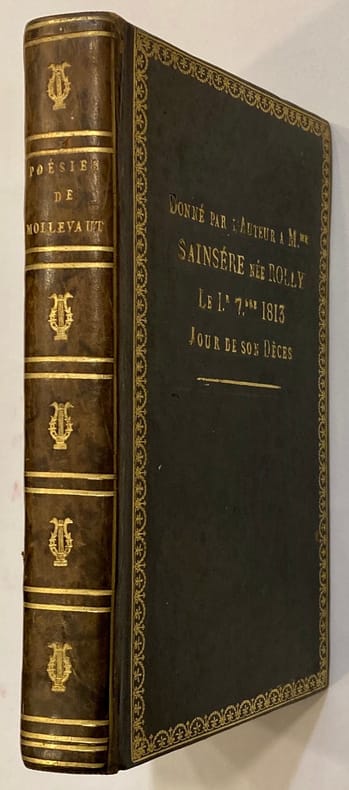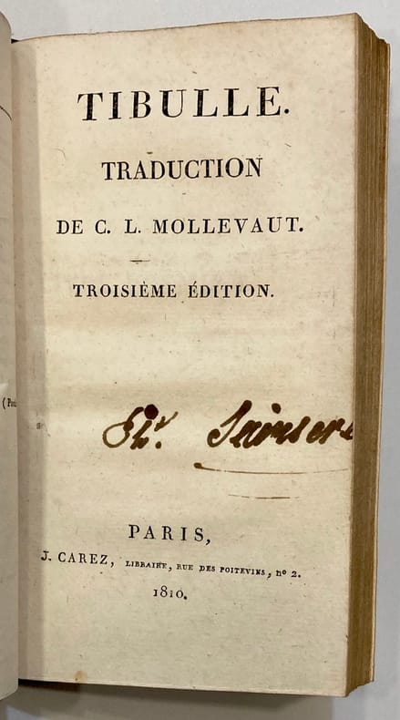 Edition originale, non signée par l'auteur. Relié à la suite : TIBULLE. Elégies. Paris. Carez. 1810. (1) f. ; 195 pp. ; (1) p. bl. Troisième édition de la traduction de Mollevaut. Edition bilingue, avec les textes en latin et en français en regard. Signature manuscrite Sainsére sur la page de titre. Sur le 1er plat, en lettres d'or : "Donné par l'auteur à Mme Sainsére née Rolly le 1er 7bre 1813 Jour de son décès". Suzanne Joséphine Rolly (1789-1813), originaire de Thionville, soit morte très jeune, peu après son mariage (6 juillet 1813). Son mari, Marie Etienne Sainsére (1782-1866), né à Vaucouleurs, négociant, s’est remarié avec une demoiselle Ferrand et a eu d’elle une postérité.Emouvant exemplaire !Ex-libris Michel Hudelot.
