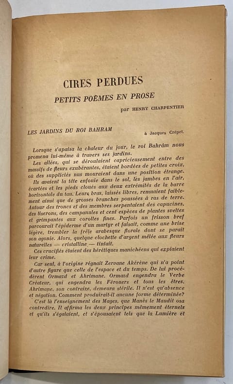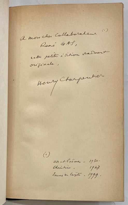 Tiré à part, numéroté 5/9 du Mercure de France de septembre 1948, allant des pages 45 à 51. Envoi autographe signé : "A mon cher collaborateur René Gas, cette petite édition vraiment originale. Henry Charpentier". Poète, Henry Charpentier fut l'exécuteur testamentaire de Stéphane Mallarmé. René Gas a d’abord travaillé au sein des éditions Georges Crès. Vers la fin des années 1940, on retrouve René Gas chez Rombaldi, comme directeur de collection, puis il sera directeur de la galerie André Maurice, sise au 140 boulevard Haussmann à Paris.