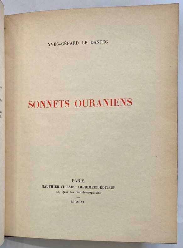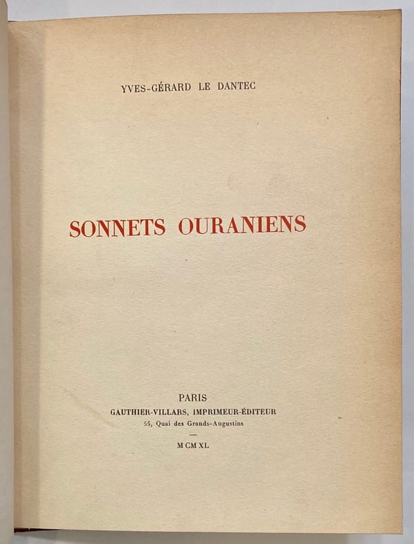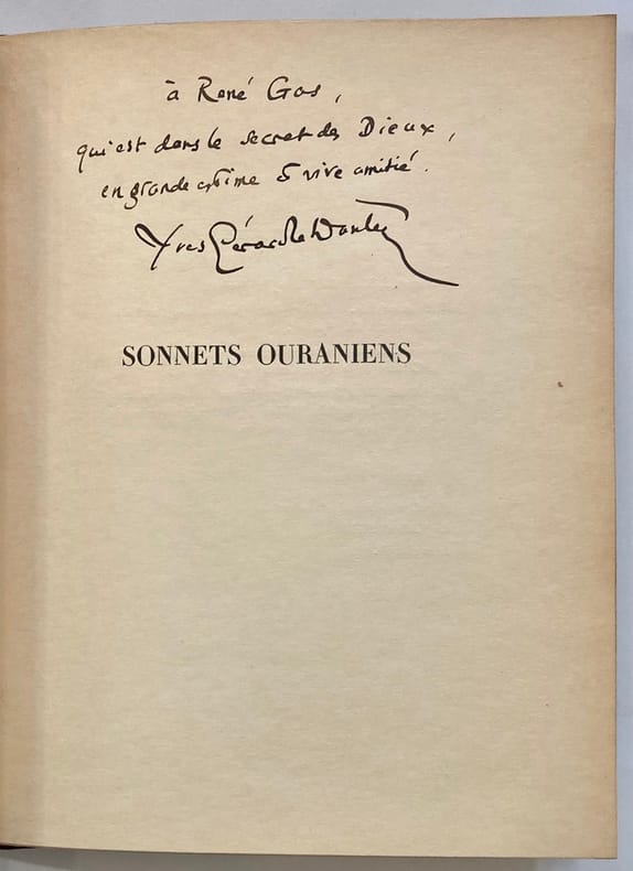 Edition originale. 1 des 300 exemplaires numérotés sur papier Japon.Envoi autographe signé : "A René Gas, qui est dans le secret des Dieux, en grande estime et vive amitié. Yves-Gérard Le Dantec". René Gas a d’abord travaillé au sein des éditions Georges Crès. Vers la fin des années 1940, on retrouve René Gas chez Rombaldi, comme directeur de collection, puis il sera directeur de la galerie André Maurice, sise au 140 boulevard Haussmann à Paris.