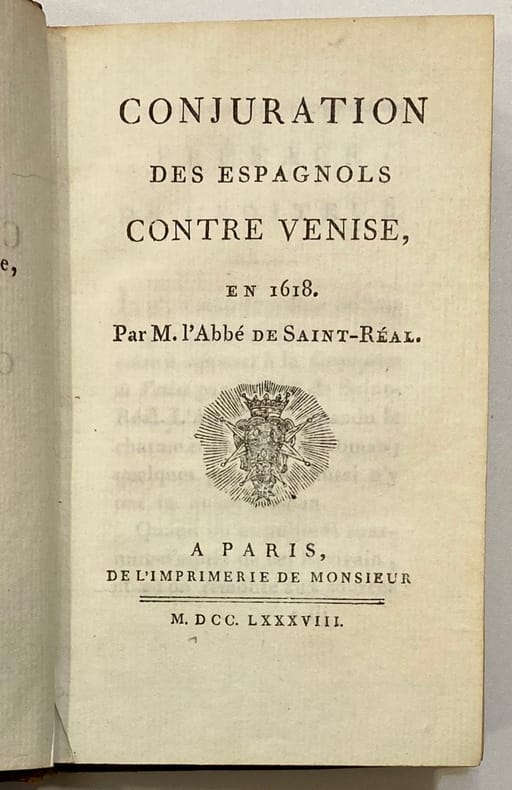 Paris de l'imprimerie de Monsieur XXIV + 168 pp. In-16 Relié En bon état 1 C'est le roman le plus populaire de l'abbé de Saint-Réal. Considéré par Voltaire comme un chef d'oeuvre, ce roman historique et moral est l'un des premiers romans véritablement modernes (Lever, Romanciers du Grand Siècle, pp. 212-215).
