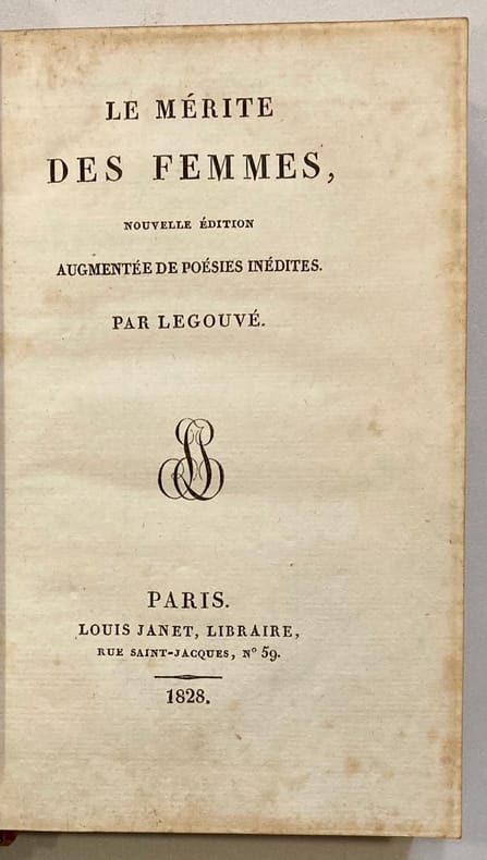 LEGOUVÉ, G. le Mérite des Femmes, poème. Seconde édition. Paris, de l’Imprimerie de P. Didot l’Ainé, An IX; 92pp.,( y compris faux-titre et titre). Frontispice gravé par Duplessis-Bertaux d’après Isabey. / Suivi de: PELLETIER-SAINT-JULIEN , F. L. Le Démérite des Femmes. Paris, de l’ Imprimerie de Guilleminet, Chez Debray, An IX; 52pp. ( y compris faux-titre et titre). / Suivi: GAETAN, Angélique –Rose. Le Mérite des Hommes. A Paris de l’ Imprimerie de Crapelet, chez Maradan, An IX; 63pp. ( y compris faux-titre et titre). Par A.P. F. Ménégault. / Suivi de: BRIQUET, H. A. : Couplets sur l’ Agriculture. Air du Vaudeville des Visitandines; pièce sans date ( c. 1795), de 3pp. / Suivi du même de: Chanson de la réunion des districts de Montmorillon et de Civrai . Air de la Carmagnole. De l’ imprimerie de Chevrier, ( 1793), 3pp. sur papier bleuté. Fête ayant eu lieu à Potiers le 7 septembre 1793. / Suivi du même de: Hymne à l’Eternel Présenté à la société révolutionnaire de Rochefort, pour être chantée le 20 prairial, an deuxième de la République. Air. Allons Enfants de la Patrie. Rochefort, chez Jousserant, ( 1794); pièce de 4pp. / Suivi de: RODOLPHE, P. C. Poésies de P.C. Rodolphe, jeune dessinatrice, recueillies par un homme de Lettres. A Paris, chez Logerot Imprimeur, An VIII; (4), 44pp. / Suivi de GENLIS, Madame de . Herbier moral ou Recueil de Fables nouvelles et autres poésies fugitives. Paris, chez Moutardier, sans date , (1799);(4), 199pp. Frontispice gravé non signé. / Suivi de FUMELH, Madame de. Oeuvres Diverses. A Genève et se trouve à Lyon, chez Faucheux, 1790; 162, (1)pp.