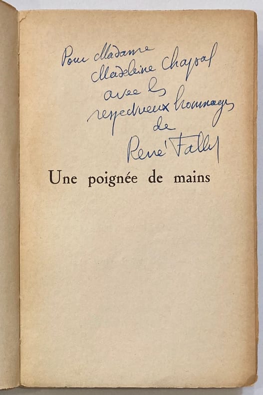 Edition originale avec envoi autographe signé de l’auteur à l’écrivain Madeleine Chapsal : "Pour Madame Madeleine Chapsal, avec les respectueux hommages de René Fallet". Dos abimé en queue.