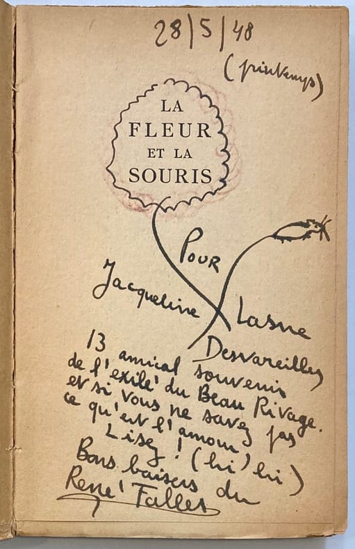 Edition originale sur papier courant.Envoi autographe signé de l’auteur daté du 28/5/1948, avec petit dessin: « Pour Jacqueline Lasue Desvareilly, amical souvenir de l’exilé du Beau Rivage, et si vous ne savez pas ce qu’est l’amour, lisez! (hi hi). Bons baisers de René Fallet ».