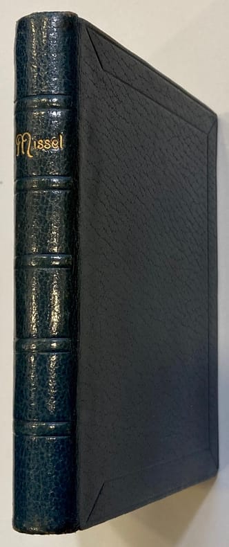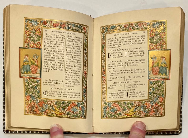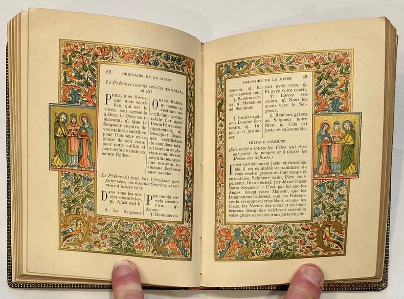 Missel illustré d’un frontispice, chaque page de texte étant richement orné de motifs colorés et d’une miniature rehaussés d’or en encadrement.Ex-libris Michel Hudelot.