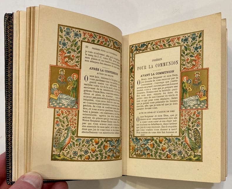 MAISON ALFRED MAME ET FILS. 1927. In-16. Relié plein cuir. Etat d'usage, Couv. convenable, Dos satisfaisant, Intérieur acceptable. 320 pages. Frontispice : image en couleurs, avec serpente. Cadre illustrée en couleurs sur toutes les pages. Nombreuses illustrations en couleurs hors texte, avec serpentes. Tranches dorées. Ornements dorés sur les plats.. . . . Classification Dewey : 264.1-Les prières