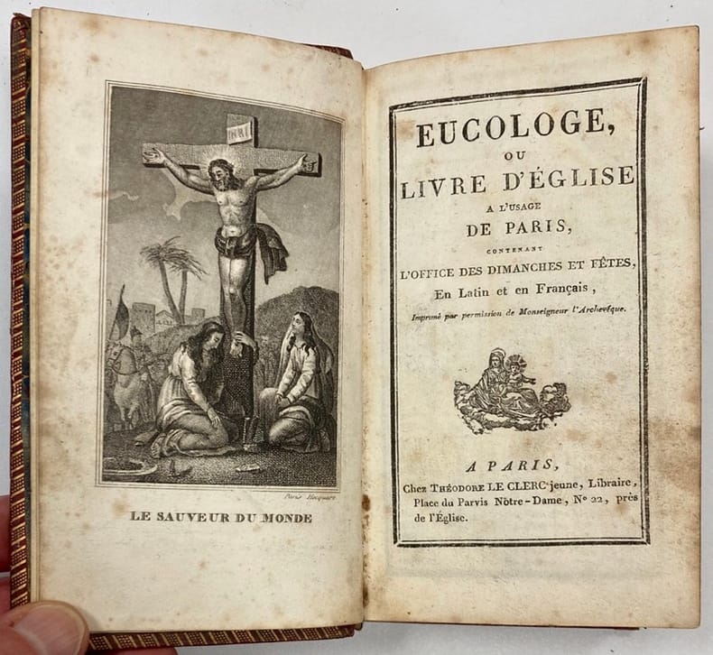 Office des dimanches et fêtes en latin et en français illustré d’1 frontispice et de 3 figures hors-texte, présenté dans une charmante reliure parlante peu commune.Rousseurs. Reliure légèrement frottée. Ex-libris manuscrit sur la 1ère garde.