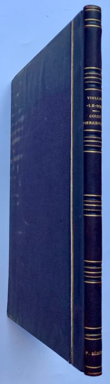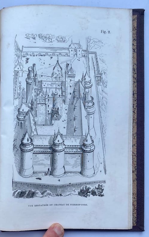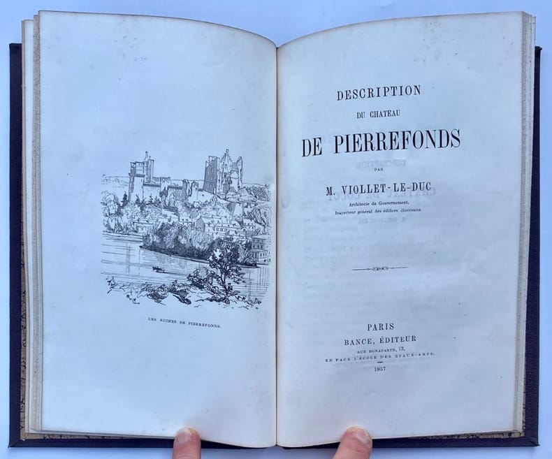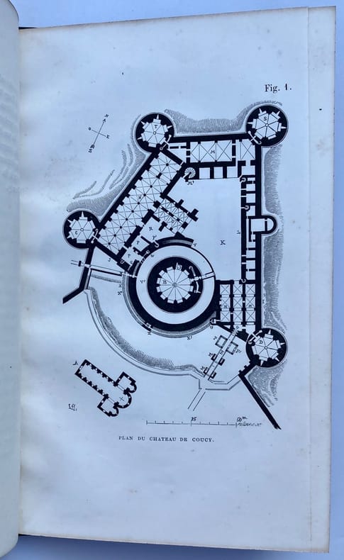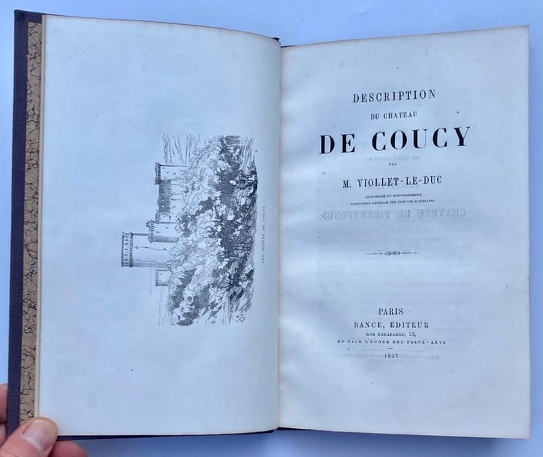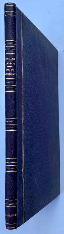 Illustré d’1 frontispice représentant les ruines de Coucy, et de 5 planches in-fine de plans et de vues du château une fois restauré.Suivi du même auteur, même date :Description du château de Pierrefonds. 23 pp. ; Illustré de 4 planches dont 1 plan et 3 vues du château restauré.Ex-libris Paul Sédille (1836-1900), architecte célèbre pour sa théorie de la polychromie et pour avoir reconstruit les magasins du Printemps et ex-libris Michel Hudelot.Petites taches sur le second plat.