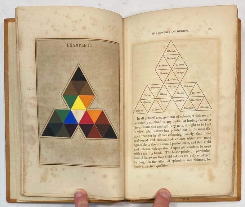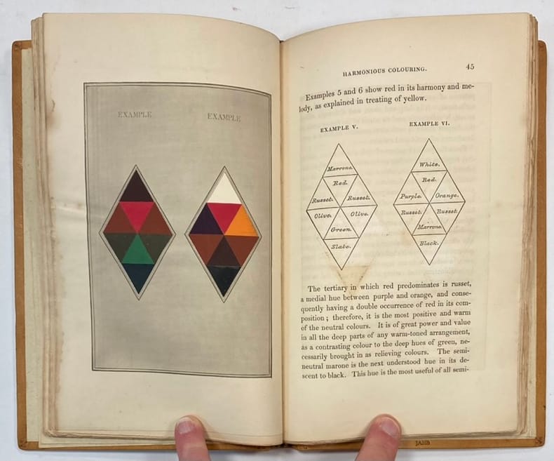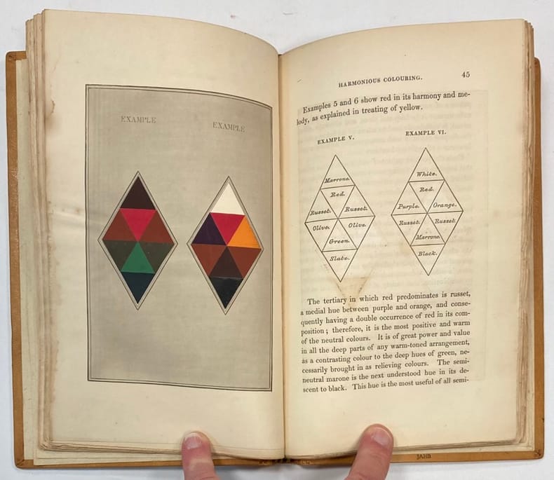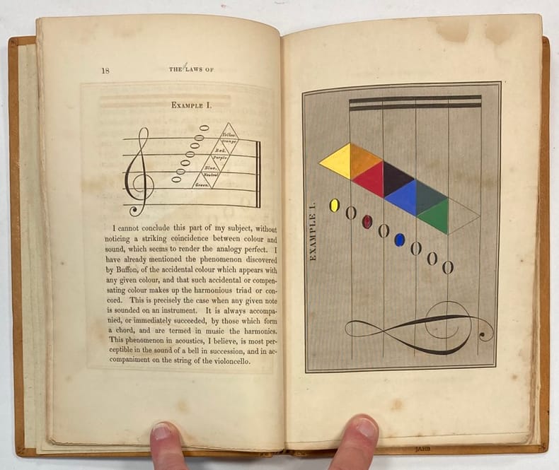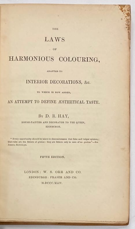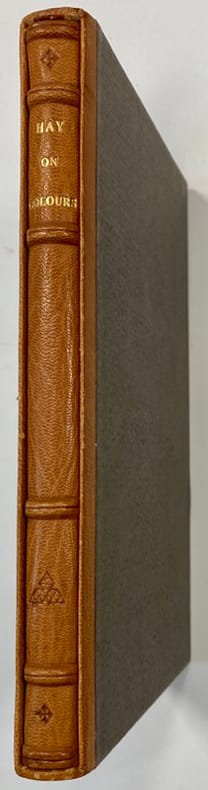 5ème édition, illustrée de 8 planches, dont 5 rehaussées. L'édition originale du traité de Hay fut publié en 1828. La Planche 1 montre une corrélation entre l'harmonie musicale et l'harmonie des couleurs. Petite tache angulaire sur les 2 premiers feuillets. Quelques rousseurs. relié à la suite, prospectus de 10 pages, pour Hay. Proportion, or the géometric principle of beauty...
