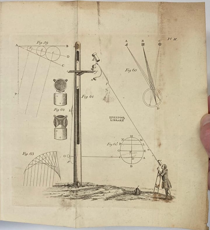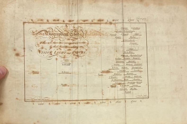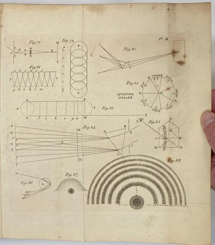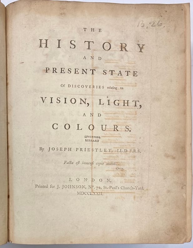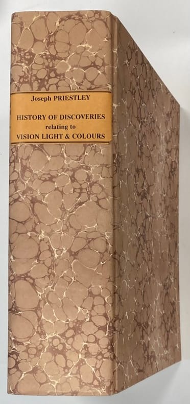 Edition originale illustrée d'un frontispice dépliant et de 24 planches dépliantes reliées en fin d'ouvrage. Scientifique et théologien américain, Priestley étudia la chimie, l'électricité, l'optique... et est considéré comme le découvreur de l'oxygène. Après avoir publié une Histoire de l'éléctricité en 1767, son Histoire de l'optique fit référence pendant plusieurs décennies. Armoiries de la dédicace mises en couleurs. Taches et rousseurs. Quelques corrections à l'encre. Déchirure sans manque pages 527-528.