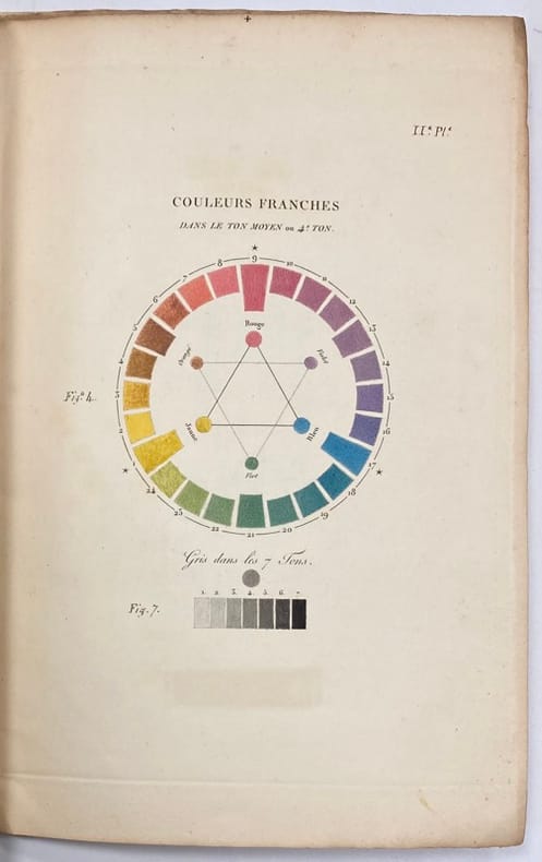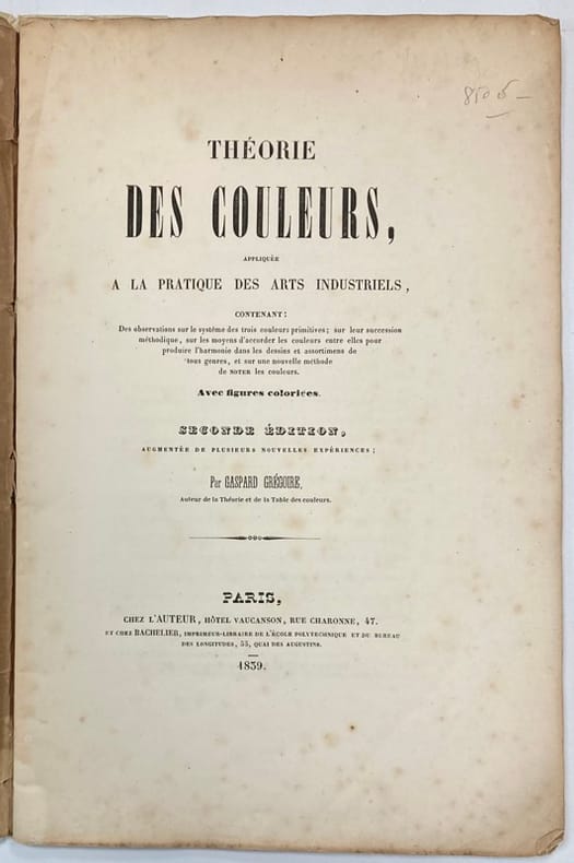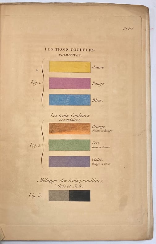 Seconde édition augmentée de plusieurs nouvelles expériences, et illustrée de 3 planches coloriées. 1ère partie seule de cette Théorie des couleurs, appliquée à la pratique des arts industriels , dont "la connaissance doit précéder et accompagner toute instruction pratique sur l'emploi des couleurs". La seconde partie, non présente ici, "traite des couleurs de la lumière, et plus particulièrement des couleurs prismatiques qui font voir séparément en deux planches coloriées les trois couleurs primitives et les trois couleurs secondaires". A la fin de la préface, Grégoire précise que "ces deux traités seront livrés ensemble ou séparément". Rousseurs.