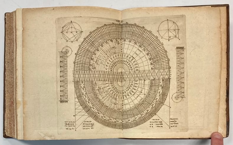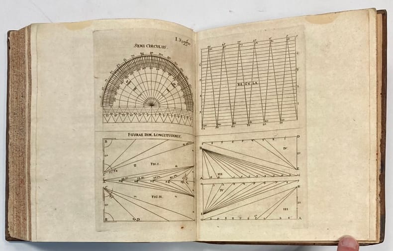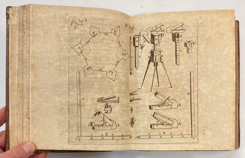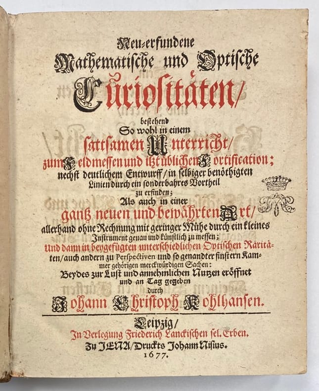 Edition originale illustrée de 24/25 planches doubles ou dépliantes. Kohlmans était professeur de Mathématiques à Coburg, et s'intéresse dans cet ouvrage à l'arpentage, à la fortification et à l'optique. Il est notamment fait mention de la Camera Obscura pages 283 et 317. Page de titre en rouge et noir. Tâche pages 145 - 148. Restauration angulaire p. 247-248, avec perte de quelques lettres. Petite galerie de vers restaurée en marge.