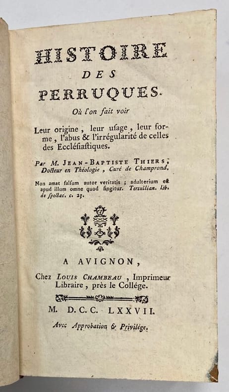 Chez Louis Chambeau Avignon 1779 In-12 ( 170 X 100 mm ) de XXII-441 pages, pleine basane fauve, dos à nerfs orné de caissons et fleurons dorés, tranches brique ( Reliure de l'époque ). Coins et coiffes usés, bon exemplaire. "les ouvrages de ce théologien sont remplis d'érudition, abondent en détails curieux et sont devenus rares" ( Brunet V, 819-820 )..Les Perruques.Ouvrage curieux. Antiquité des perruques. Les femmes juives en portaient. L'abbé de la Rivière, évêque de Langres, patriarche des ecclésiastiques perruquets. Des Barêtes. Des Mitres. Des Aumusses. Des Capuchons. Des Chapperons. Des Coiffes. Des Amitz. Des Camils. Des Bonnets Carrés. Des Calottes. Traditions de l'Église. Condamnation des cheveux bouclés et frisés. Cheveux, barbes et sourcils teints. Condamnation des perruques ecclésiastiques. Diverses sorets de perruques : Des grandes, des petites, des perruques à calottes, à Bichon, à la Moutonne, des perruques d'abbé, des perruques teintes, poudrées, parfumées, sans couronnes, à fausses couronnes, à couronnes de couleur de chair. Moyen pour empêcher les ecclésiastiques de porter des perruques.