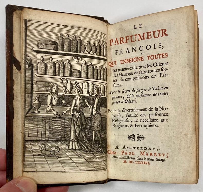 Une des premières éditions, qui sont toutes très rares (Oberlé), de ce manuel rédigé par un parfumeur parisien, Simon Barbe.Elle est ornée d’un joli frontispice gravé montrant une boutique de parfumeur au XVIIème siècle.L’ouvrage traite des poudres pour les cheveux, des savonnettes, des essences et huiles parfumées aux fleurs, des pommades, des parfums bons pour la bouche, des eaux de senteurs, des poudres, des peaux et gants parfumés, du tabac : comment le réduire en poudre, le purger, le teinter, le parfumer...Sur la dernière garde, amusant ex-libris manuscrit de son 1er possesseur, un parfumeur, apposé juste après l’achat du livre : « Ce livre appartient au sieur Dufresne marchand parfumeur à Meinnebourg. Si quelqu’un le trouve il aura deux écus pour récompense. Fait à Amsterdam ce premier de mai 1696. »Annotations anciennes sur les premiers feuillets de garde.Ex-libris Kilian Fritsch. Brunet IV, 369. - Oberlé, Les Fastes de Bacchus, n° 1145.