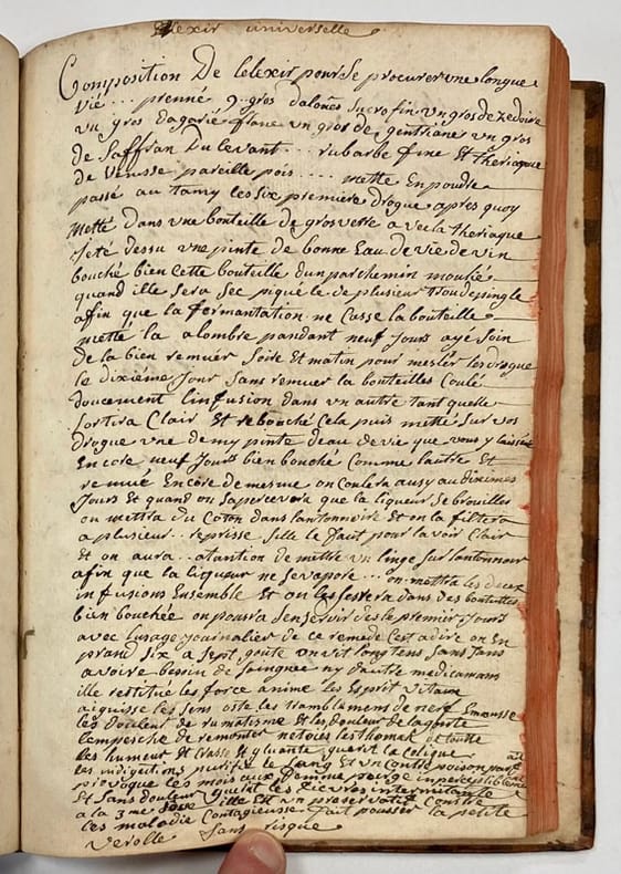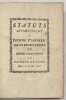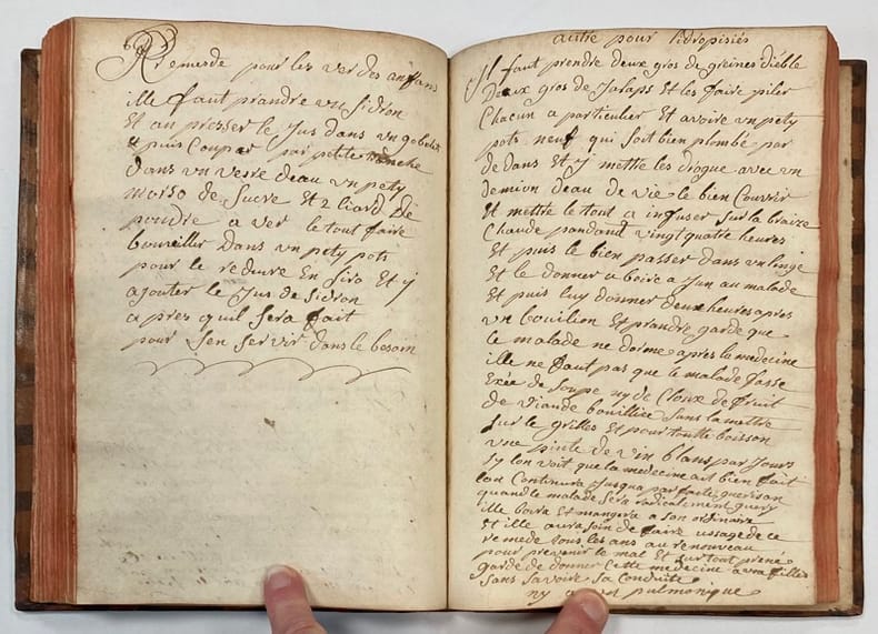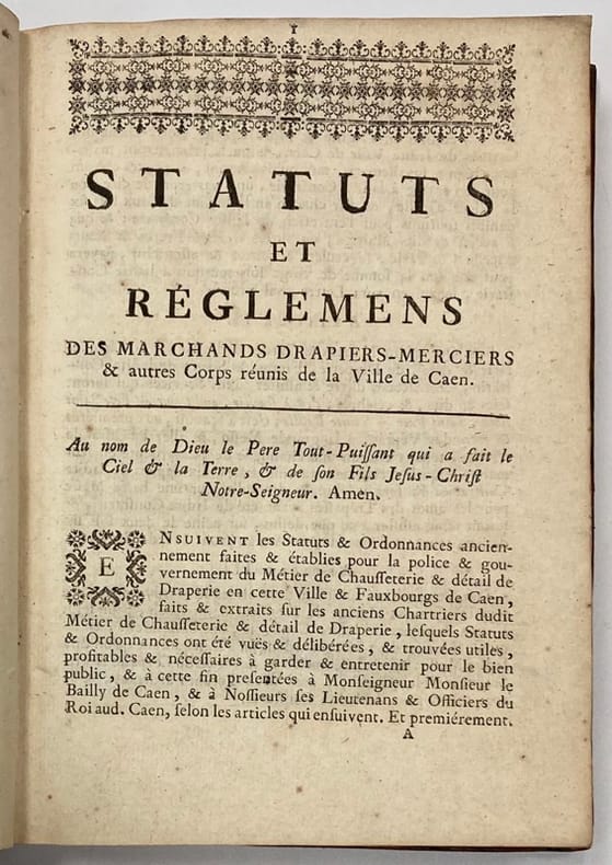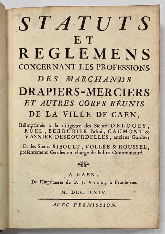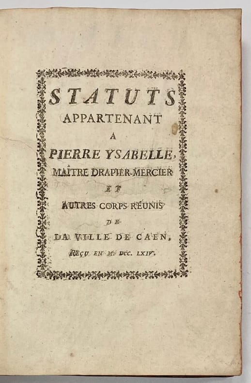 Importante et rare publication éclairant la profession de drapier-mercier à Caen au XVIIIe siècle.Elle contient non seulement les statuts de cette communauté, mais également les extraits de registres, l’Édit du roi «Pour l’établissement des Arts & Métiers en Communauté, et pour fixer les Barbiers-Etuvistes & Perruquiers » de mars 1673, des Arrêts du Conseil...Cet exemplaire a été relié avec une page ex-libris spécialement imprimée à l’époque: « statuts appartenant à Pierre Ysabelle, maître drapier-mercier et autres corps réunis de la ville de Caen, reçu en M. DCC. LXIV. »Il comporte à la fin 58 feuillets blancs reliés dont six pages enrichies à l’époque de recettes et élixirs...Habiles restaurations à la reliure, déchirure réparée au feuillet d’ex-libris.Ex-libris Kilian Fritsch.