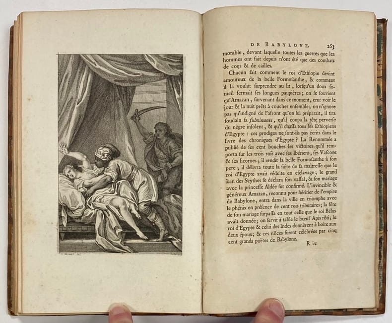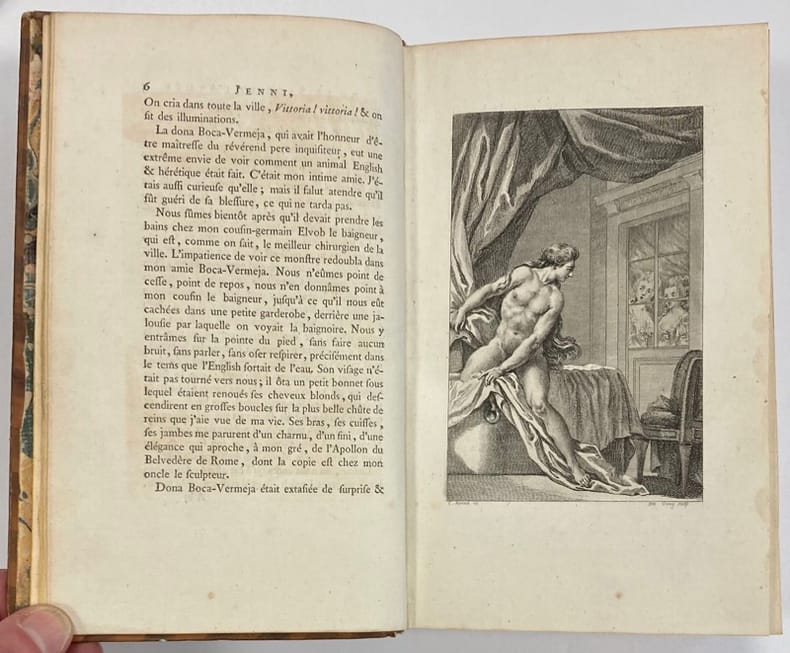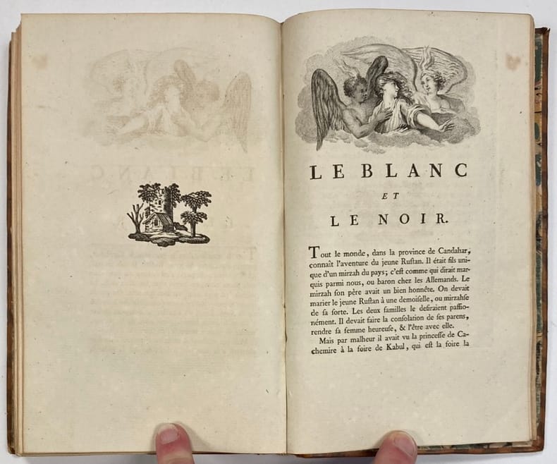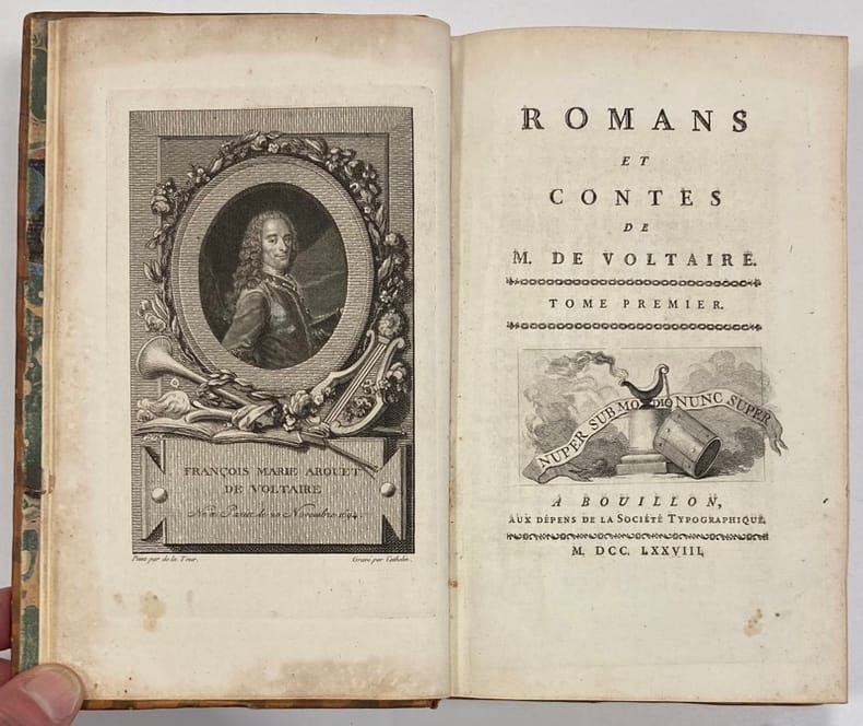 Première édition illustrée des Romans et Contes de Voltaire, ornée d’1 portrait de l’auteur par La Tour, de 57 gravures à pleine page de Marillier, Martini, Monnet et Moreau, et de 13 vignettes de Monnet.« Très belles illustrations, pourvu que les gravures soient avant les numéros », ce qui est le cas pour notre exemplaire.Avis au relieur relié en fin d’ouvrage.Quelques mors fendus et coiffes arasées. Infimes rousseurs. Cohen,1038.