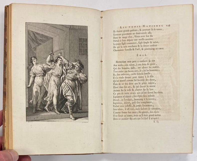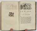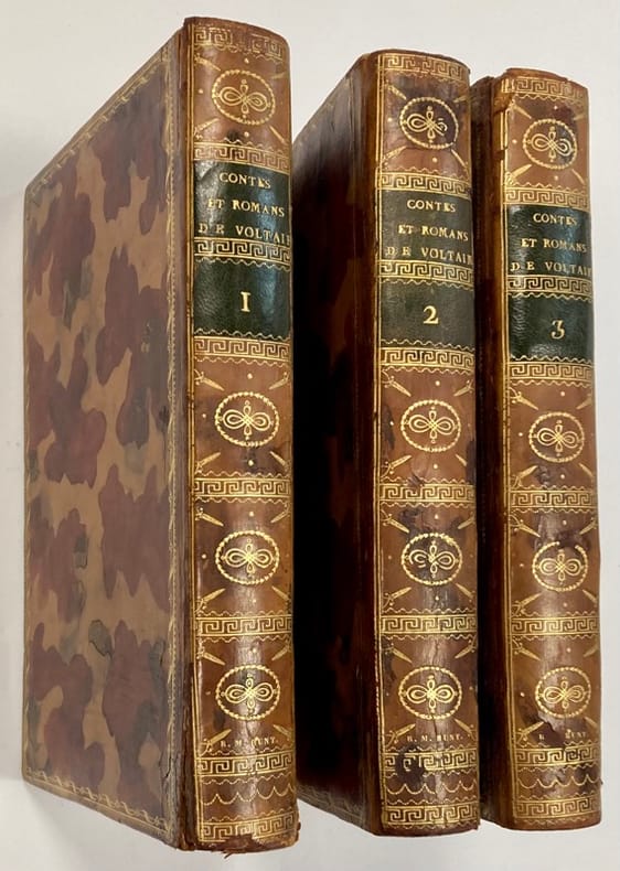 1778 1778, aux dépens de la société typographique, à Bouillon. 3 vol. in-8 (20.5 x 13 cm) reliés de 304; 320 et VI-136 pages.Superbe reliure de l'époque plein veau raciné fauve clair , dos lisse richement orné de caissons, filets, frises, fleurons, tomaison, titre, et date en queue, frappés à l'or fin. Pièces de titre en maroquin vert et tomaison rouge , filet doré en encadrement des plats, Ouvrage illustré d'un frontispice, 16 planches; 1 frontispice, 19 planches; 1 frontispice, 20 planches. Précieuse édition illustrée collective des Romans et Contes de Voltaire (Bengesco, I, no. 1522). "57 figures par Marillier, Martini, Moreau et surtout Monnet (52 sur les 57i), 13 vignettes en-tête par Monnet, 1 fleuron aux titres et 1 portrait de Voltaire gravé par Cathelin d'après Quentin De La Tour en frontispice du premier vol. "(Cohen, col. 1038).On trouvera dans cette édition : Zadig, La Princesse de Babylone, Le Blanc et le noir, Micromégas, Candide ou l'optimisme + une trentaine de contes en prose et en vers.