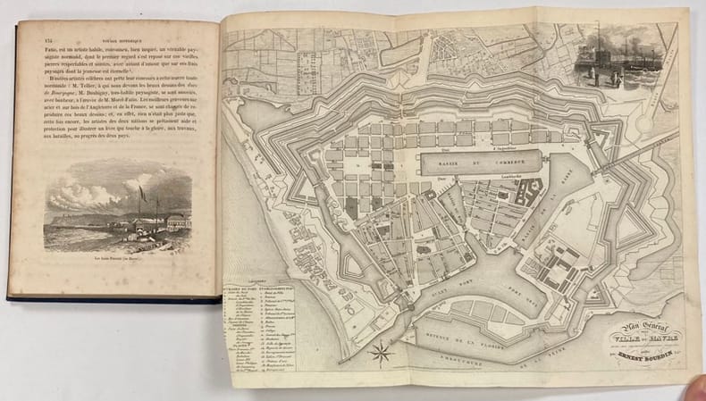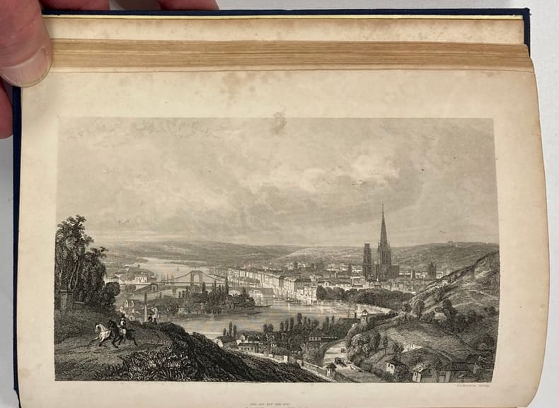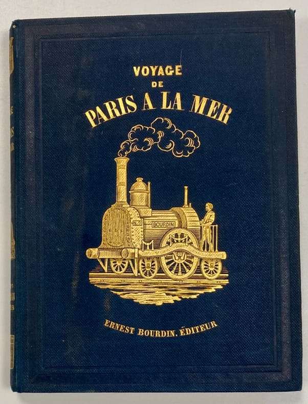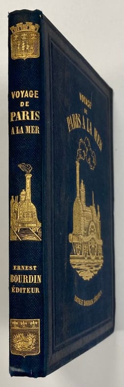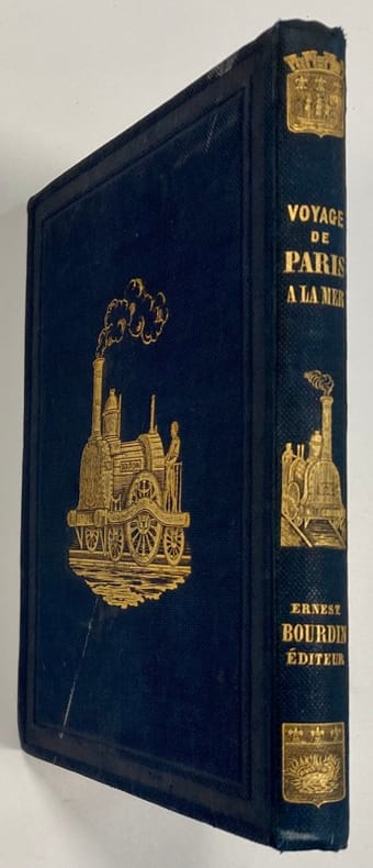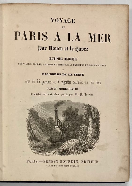 …description historique des villes, bourgs, villages et sites sur le parcours du chemin de fer et des bords de Seine.Ouvrage orné de 75 gravures et de 7 vignettes, dont 1 frontispice, dessinées sur les lieux par Morel-Fatio. Il est également illustré de 2 cartes et 2 plans dépliants. La 2ème partie de l’ouvrage est consacrée au Voyage de Rouen au Havre par les bateaux à vapeur.Ex-libris Michel Hudelot.Rousseurs éparses.