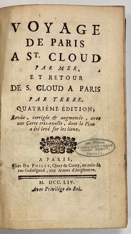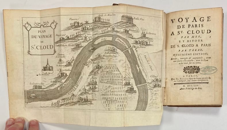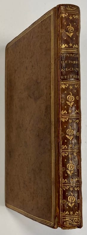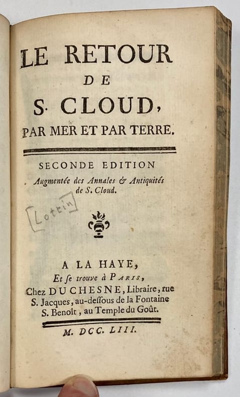 4ème édition revue, corrigée & augmentée, "avec une carte très-exacte, dont le plan a été levé sur les lieux".Parodie de voyage, où l’auteur, de manière humoristique, parisien de souche, part à l’aventure pour aller retrouver Henriette, installée à St Cloud : « Je braverai les fatigues du voyage, j’affronterai les périls de la mer, je m’exposerai aux inconvénients du changement d’air, il n’est rien en un mot que je ne vous sacrifie… »Il va même jusqu’à rédiger son testament avant son départ!Cachet ex-libris Dr Carteron. Petite déchirure sans manque au plan.Suivi de: Retour de Saint-Cloud par mer et par terre. La Haye et Paris. Duchesne. 1753. VII-XXIV. ; 120 pp.Seconde édition augmentée des annales & antiquités de S. Cloud.Reliure tachée et frottée. Petit manque au mors inférieur. Rares rousseurs.Barbier IV, 1077.