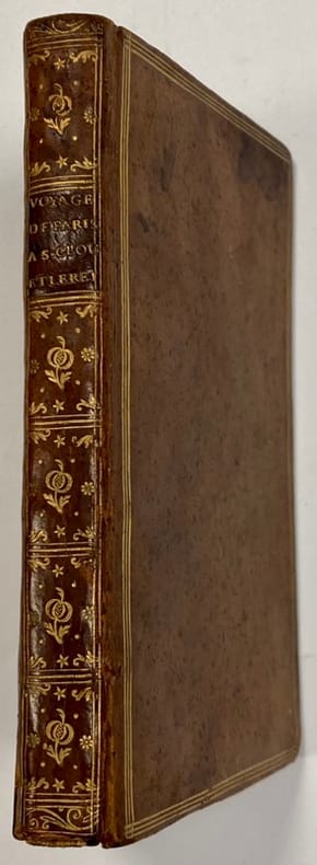 Un volume petit in-12°, reliure cuir de l’époque, avec un dos à 5 nerfs, avec une pièce de titre sur maroquin rouge, une vignette gravée sur la page de titre représente une lanterne portée par un angelot dans la nuit... - ESSAI SUR LES LANTERNES: XII et 156 pp. (Edition originale). - VOYAGE DE PARIS A St CLOUD PAR MER ET RETOUR DE St CLOUD A PARIS PAR TERRE: XXIV et 91 pp. (3ème édition).Ces deux textes sont évidemment assez proches par leur ton humoristique et l’on peut comprendre qu’ils aient été reliés dans un même volume.Mais notre exemplaire n’est hélas pas complet de la carte annoncée sur la page titre du VOYAGE (”avec une Carte très exacte dont le plan a été levé sur les lieux...” Cette carte (dont nous joignons une photocopie) n’a pas été reliée car le volume ne présente aucune trace d’arrachement . Sinon, malgré quelques marques du temps, notre volume peut être dit en ETAT TRES SATISFAISANT.