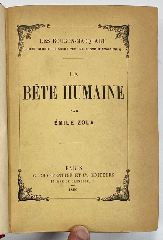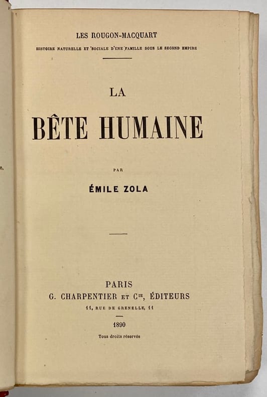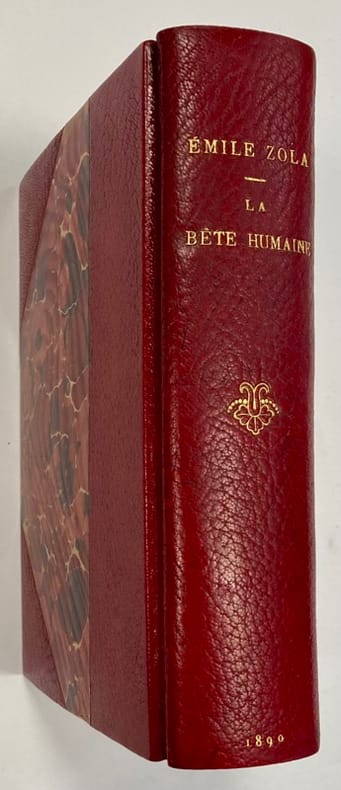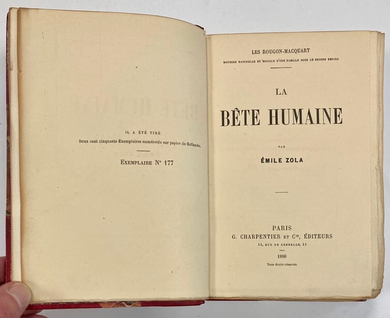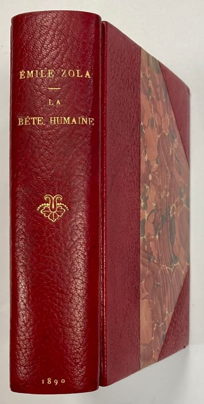 Edition originale. 1 des 250 exemplaires numérotés sur Hollande, seul grand papier.Ce roman se déroule sur la ligne de train Paris-Le Havre et comprend 2 héros : Lantier, le mécanicien et La Lison, la locomotive. C'est le 17ème volume des Rougon-Macquart. Ex-libris imprimé H. Grandjean.