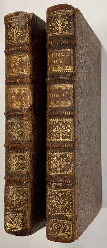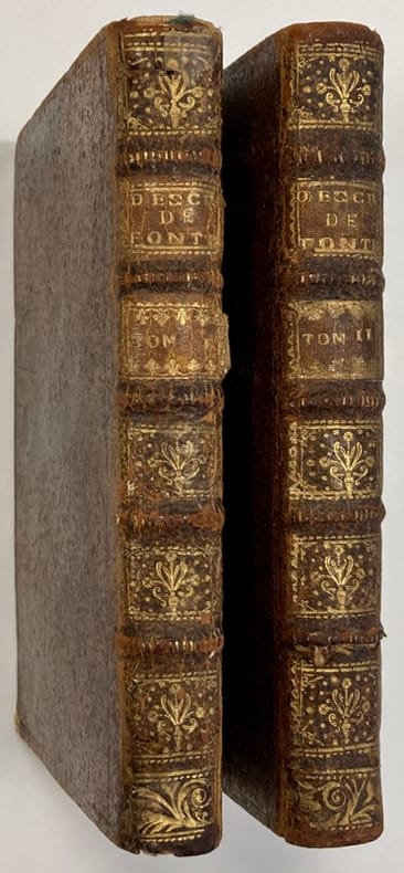 Paris, André Cailleau, 1731. Deux volumes in-12 (17 cm x 10 cm), 4-6-4-243-14-310 pp. Volume I : Une grande planche dépliante : Plan général de Fontainebleau. Une planche dépliante : Elévation de la Porte Dauphine de Fontainebleau du côté de la cour des Cuisines et Elevation du Côté de la Cour Ovale. Une planche dépliante : Coupe de l’Escalier du Fer à Cheval de Fontainebleau. Une planche dépliante : Plan de l’Escalier du Fer à Cheval de Fontainebleau. Une planche dépliante : Elévation du grand Autel de la Chapelle de Fontainebleau. Une planche : Médaillon qui est au-dessus de la porte de la Chambre du Roi à Fontainebleau. Volume II Une planche dépliante : Grotte du jardin du Pin de Fontainebleau et Fontaine de Bleau, détruite en 1713. Aux armes Luynes sur les plats ; Pleine basane, dos à cinq nerfs, caissons ornés, pièces de titre et de tomaison, tranches rouges mouchetées.
