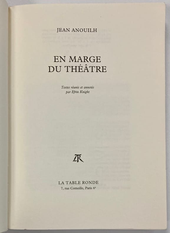 La Table Ronde Dos carré collé 2000 In-8 (14 x 20,5 cm), dos carré collé, 319 pages, agrémenté d'une photo originale de la future femme de Jean Anouilh à 14 ans, la comédienne et femme de lettres Nicole Larçon ; pliures au dos, quelques brunissures au quatrième plat, assez bon état. Livraison a domicile (La Poste) ou en Mondial Relay sur simple demande.