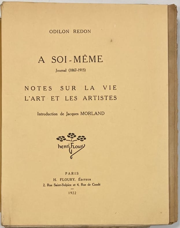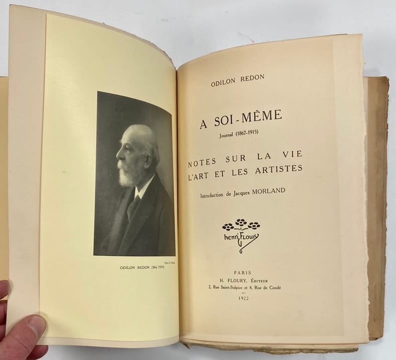 Édition originale, un des 125 exemplaires num. sur pur fil avec une eau-forte originale d'Odilon Redon sur japon nacré. Elle est ornée d’un portrait photographique de l’artiste par H. Manuel. Odilon Redon justifie ainsi cet ouvrage dans ses premières pages : “J'ai fait un art selon moi. Je l'ai fait avec les yeux ouverts sur les merveilles du monde visible, et, quoi qu'on en ait pu dire, avec le souci constant d'obéir aux lois du naturel et de la vie. [...] Les notes que je formule ici aideront plus à la compréhension de cet art que tout ce que je pourrais dire de mes concepts et de ma technique. L'art participe aussi des événements de la vie. Ceci sera la seule excuse de parler uniquement de moi.” Bon état d’occasion