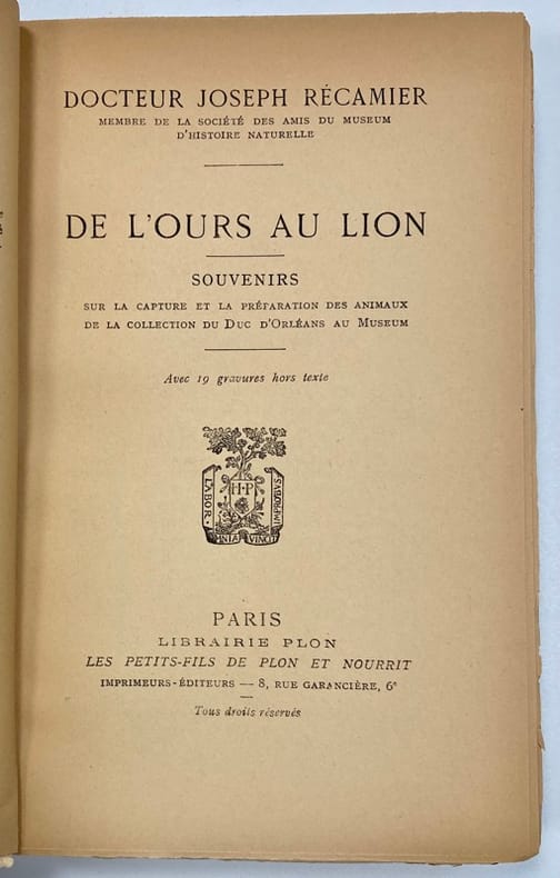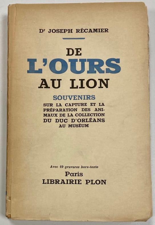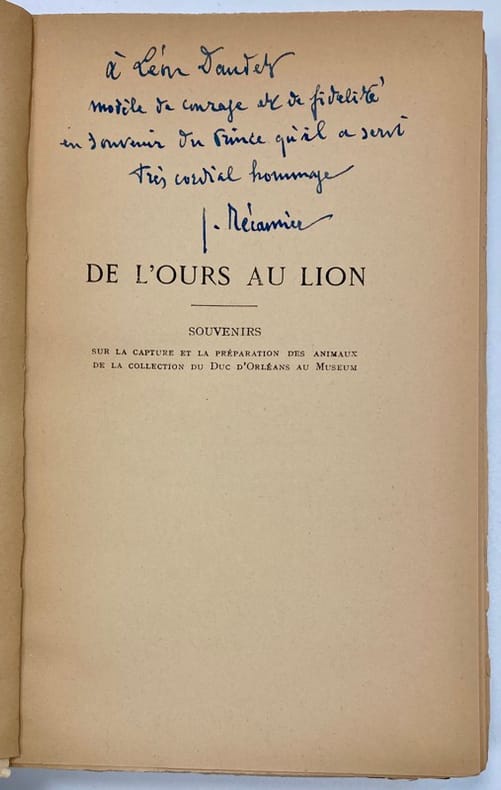 Edition originale sur papier couvrant de ces "souvenirs sur la capture et la préparation des animaux de la collection du Duc d’Orléans au Museum ». Illustré de 19 reproductions photographiques d’animaux sauvages.Exemplaire de Léon Daudet, avec envoi autographe de l’auteur : « à Léon Daudet, modèle de courage et de fidélité, en souvenir du Prince qu’il a servi, très cordial hommage. J; Recamier»Déchirures le long des charnières, dos passé.