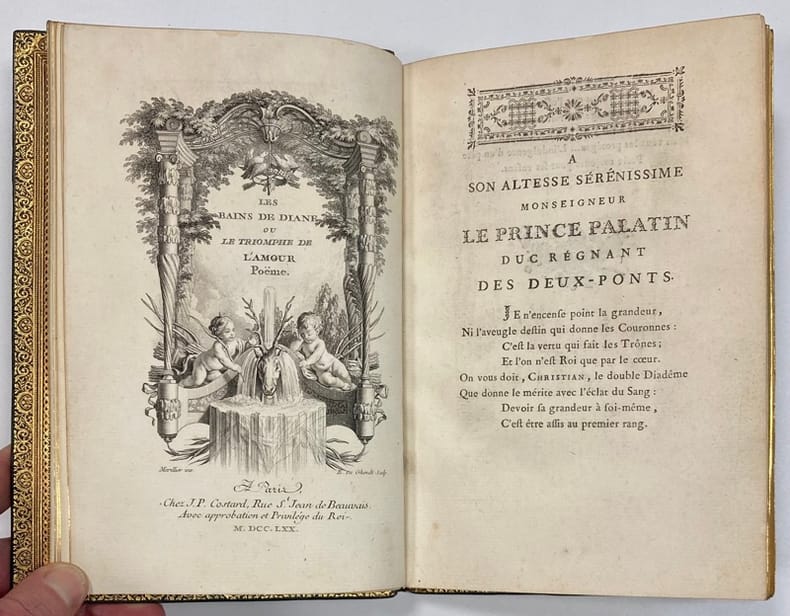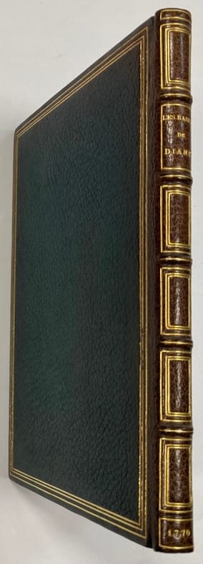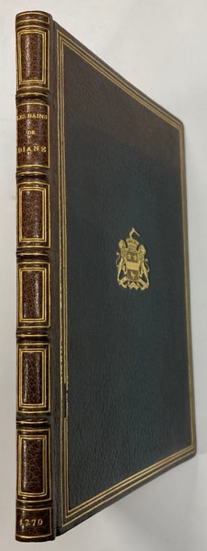 1770 Paris. Costard. 1770. 1 volume in-8 à toutes marges, plein maroquin vert XIXème aux armes, triple filet doré en encadrement sur les plats, dos à nerfs orné, tranches dorées, bordure intérieure ornée d’une dentelle dorée. Reliure signée Visinand. (2) ff. ; 123 pp. ; (3) pp.