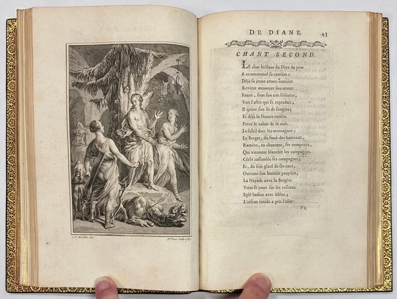 Paris, J.P. Costard, 1770. 1 vol. in-8°, veau fauve marbré, dos lisse orné de fleurons dorés, pièce de titre en maroquin La Vallière, encadrement d'un filet à froid sur les plats, roulette dorée sur les coupes. Reliure de l'époque, coins émoussés, petit manque à la coiffe de queue. Bon exemplaire. Titre-frontispice hors-texte et 3 figures hors-texte de Marillier gravées en taille-douce par De Ghendt, Massard, Ponce et Voyez, 123 pp., (3) pp. Quelques petites rousseurs.