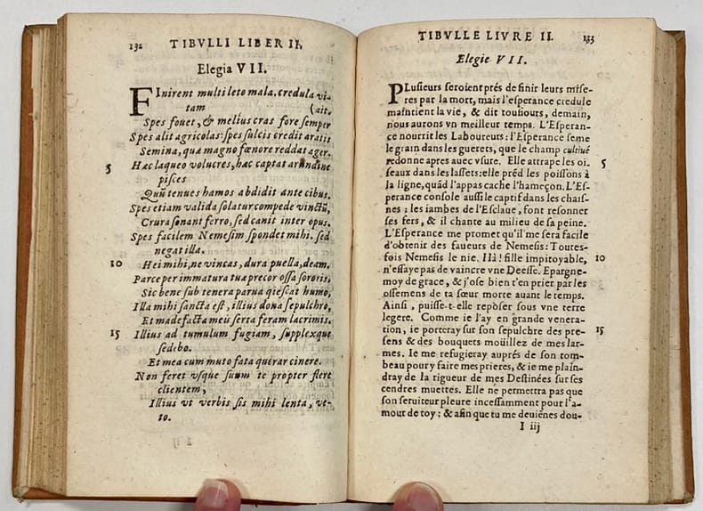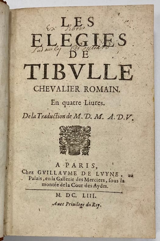 Editions originales de ces deux traductions en prose de Michel de Marolles. Les deux textes sont bilingues avec la traduction française face au texte latin et sont tous deux suivis des remarques de Marolles. Le volume est orné d'un frontispice général destiné à la collection des trois poètes élégiaques : Catulle, Tibulle et Properce. Mais on trouve rarement les trois traductions réunies. On peut lire au contreplat, bien qu'il soit rayé d'un trait de plume un ex-dono de Michel de Marolles daté d'Août 1654. Peu courant. Cioranescu, 46043; Bosseboeuf, 284; manque à Taschereau.