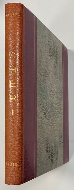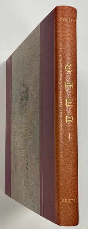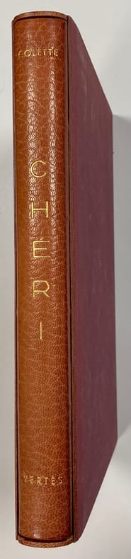 First edition - presentation-copy and one of 175 numbered copies on Hollande (premier papier), out of a total of 725 numbered copies - of Colette's fascinating novel ""Chéri"", published at the dawn of the roaring 20'ies. The scandalous novel, which portrays the love between an older woman and a much younger man, is partly inspired by Colette's own life, and is considered one of her very best works. Extremely controversial as a person, Colette has always been the object of fascination as well as controversy. In 1893, she married Henry Gauthier-Villars, who was already a famous author and publisher. He used the pen-name ""Willy"", under which Colette's famous first novels, the Claudine-stories, also appeared. Colette and Willy separated in 1906, with a final divorce in 1910. Colette is well known for the series of lesbian relationships she embarked upon after her separation. In 1912, however, she married Henry de Jouvenel, editor of Le Matin, and took his name. Not for her publications, but she clearly used it in her personal correspondence. Their marriage ended in divorce in 1924, however, due partly to her affair with her 16-year-old stepson, Bertrand de Jouvenel. Chéri is partly based upon her experiences with her much younger stepson. "" 'Me a feminist?' She scoffed in 1910. 'I'll tell you what the suffragettes deserve: the whip and the harem'. COLETTE is an intriguing and flamboyant figure. Born in Burgundy in 1873 she moved to Paris at the age of twenty with her husband the writer and critic Henry Gauthiers-Viller (Willy). Forcing Colette to write, Willy published her novels in his name and the Claudine series became an instant success. She escaped her exploitative first husband to live by her pen and work in music-halls as a dancer. Colette had a lesbian love affair with a niece of Napoleon's, she married three times, had a baby at 40 and at 47, preferring 'passion to goodness', she seduced her teenage stepson. In the meantime she wrote stunning novels that were admired by Proust and Gide -- Gigi, Sido, Cheri, and Break of Day. Colette lived to be over 80. She was the first woman President of the Academie Goncourt and was the first woman in France to be accorded a state funeral."" ""Colette, in full Sidonie-Gabrielle Colette, (1873 - 1954), outstanding French writer of the first half of the 20th century whose best novels, largely concerned with the pains and pleasures of love, are remarkable for their command of sensual description. Her greatest strength as a writer is an exact sensory evocation of sounds, smells, tastes, textures, and colours of her world. Her best work was produced after 1920 and followed two veins. The first vein followed the lives of the slightly depraved, postwar younger generation. Among these novels are Chéri (1920) and La Fin de Chéri (1926" The Last of Chéri), dealing with a liaison between a young man (Chéri) and an older woman... (Encycl. Britt.). René Baer (1887 - 1962) was a famous French author, journalist, playwright, and songwriter. Georges Leroux (1922-1999) was one of the most accomplished and esteemed French binders of the twentieth century. Before he became a book binder, in 1959, he was a poet. His works are known for their exotic materials, use of metallic effects and strong polychromatic color.
