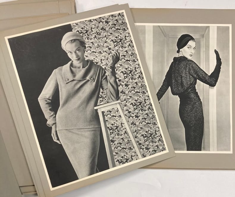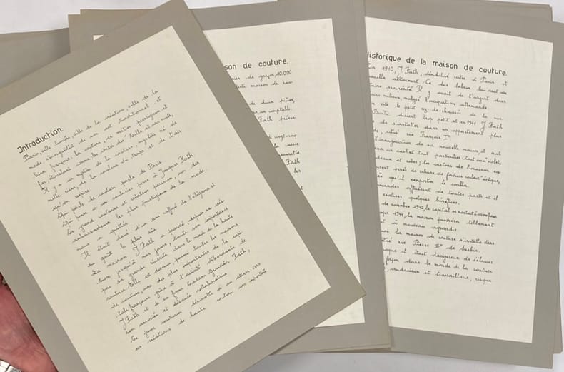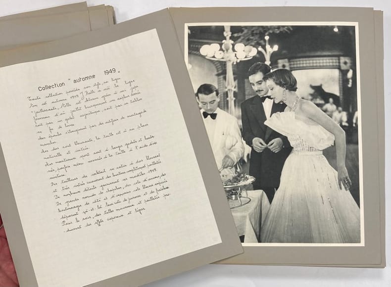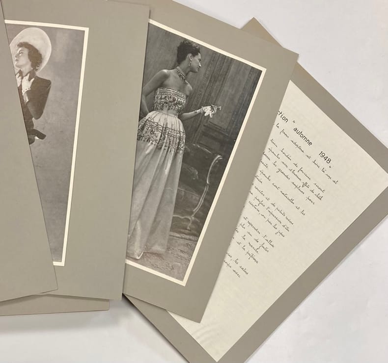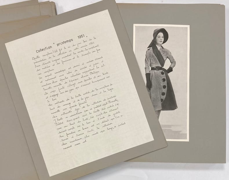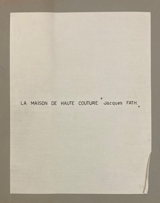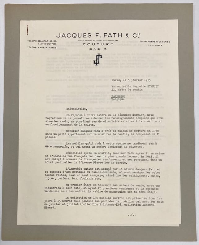 Maquette manuscrite inédite et complète de cette étude sur la maison du couturier Jacques Fath.Elle comporte un titre, un portrait du couturier, 38 pages de texte manuscrit, 44 pages d’illustrations et 3 documents originaux, tous contrecollés sur des feuillets de papier fort numérotés.Les illustrations proviennent de publications de mode et de publicités, la plupart en noir et blanc, quelques-unes en couleurs.Cet ouvrage fut réalisé par Huguette Stenuit, étudiante belge de Waterloo, qui choisit ce thème pour son travail de thèse.Les 3 documents en fin d’ouvrage sont 3 lettres tapuscrites répondant à ses sollicitations. Elles sont à l’en-tête de L’Officiel de la couture et de la mode de Paris (signée par sa directrice Andrée Castanié), La Chambre syndicale de la couture parisienne, et de la Maison de couture Jacques Fath & Cie (comportant 2 pages signées par un représentant de la maison). L’étude retrace l’incroyable ascension de ce talentueux autodidacte parti de rien et dont la notoriété, symbole du chic parisien, rayonnera largement au-delà des frontières. Il habillera les plus grandes stars d’Hollywood allant même jusqu’à créer la robe de mariée de Rita Hayworth!Elle décrypte également les sources d’inspiration du couturier, son style reconnaissable à ses silhouettes élancées, et les dessous des préparations de ses différentes collections de 1940 à 1954. Une liste des ouvrages et journaux féminins consultés se trouve à la fin de son étude. Formidable et unique document sur la mode qui, à travers l’histoire singulière de la maison Jacques Fath, nous permet d’intégrer le coeur des années fastes de la haute-couture parisienne.Ex-libris Kilian Fritsch. Etui cartonné abimé.