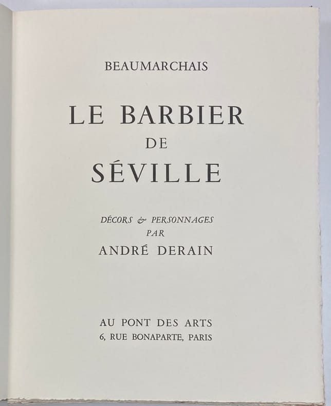 Edition illustrée par André Derain d’une couverture, de 8 doubles pages et de nombreuses compositions en couleurs in-texte.1 des 100 exemplaires numérotés sur vélin de Rives à la forme.Les décors et costumes ont été créés par l’artiste en 1953 pour la représentation de l’Opéra de Rossini au festival d’Aix-en-Provence.