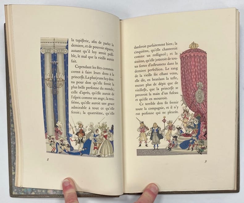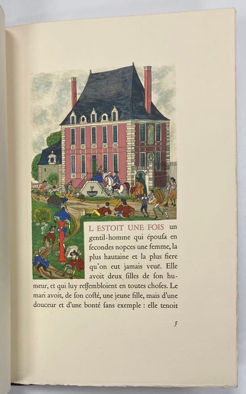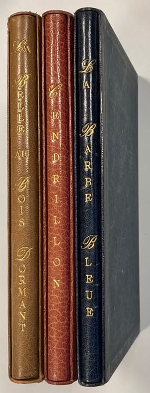 Édition illustrée par Henry Lemarié de 109 compositions in-texte en couleurs (respectivement 45, 25 et 39) dont 3 pages de titre.Exemplaires numérotés sur vélin de Rives.Prospectus en noir de « La Belle au bois" en fin d’ouvrage. Collection illustrée de charmantes miniatures dans des reliures étonnamment sobres et élégantes de Knoderer, bien éloignées de ses reliures-objets!Dos passés.