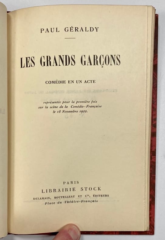 1 vol. in-12 reliure bradel demi-toile verte, couvertures du premier titre conservée, Le Grand-Père. Poème dit par M. de Féraudy à la Comédie-Française, Librairie Armand Colin, Paris, s.d.[ 1915 ], 11 pp. [Suivi de : ] Les grands Garçons. Comédie en un acte représentée pour la première fois sur la scène de la Comédie-Française le 18 Novembre 1922, Librairie Stock, Paris, s.d., 48 pp.