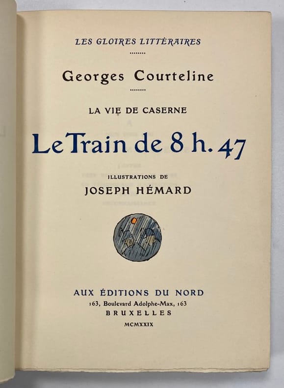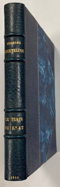 Exemplaire revêtu d'une pleine reliure du temps. Il s'agrémente de compositions à pleine-page et en couleurs d'Olivier Kaeppelin. Le Train de 8h47 dépeint les absurdités d'une discipline qui, poussée à l'extrême, provoque l'injustice et l'anarchie. Rares rousseurs dans le texte ; davantage marquées sur le premier plat de la couverture papier originelle ainsi que sur les feuillets liminaires. Du reste, bonne condition.