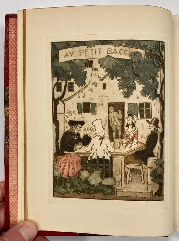 Ouvrage illustré par Sylvain SAUVAGE d'un frontispice à l'eau-forte en couleurs, de 9 hors-texte gravés sur bois en noir, les autres dans le textes, bandeaux et culs-de-lampe, lettrines en rouge et noir. Tirage à 1107 exemplaires numérotés. Celui-ci (n°531), est l'un des 900 exemplaires numérotés sur Rives.