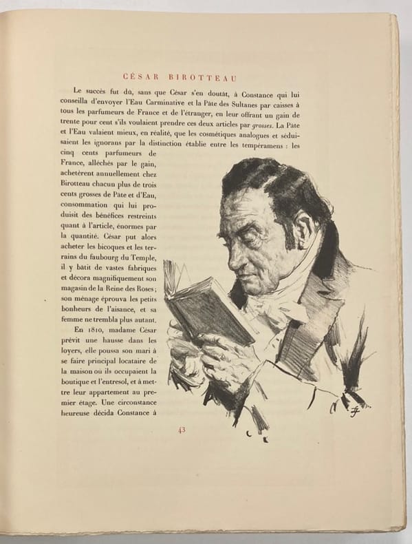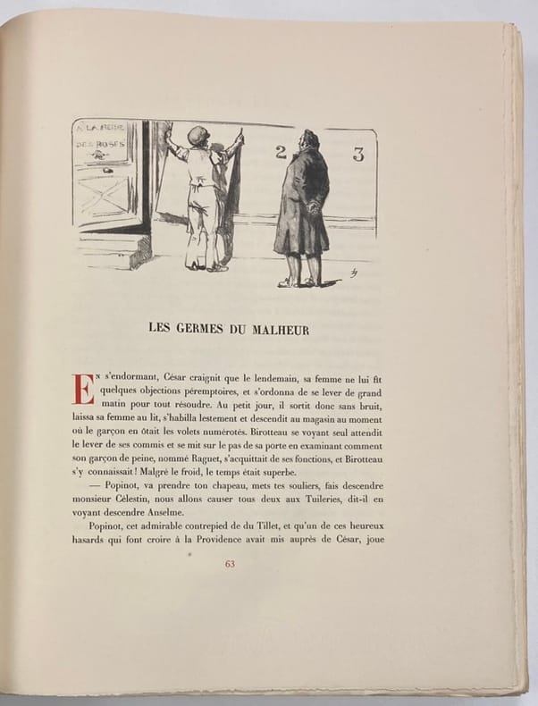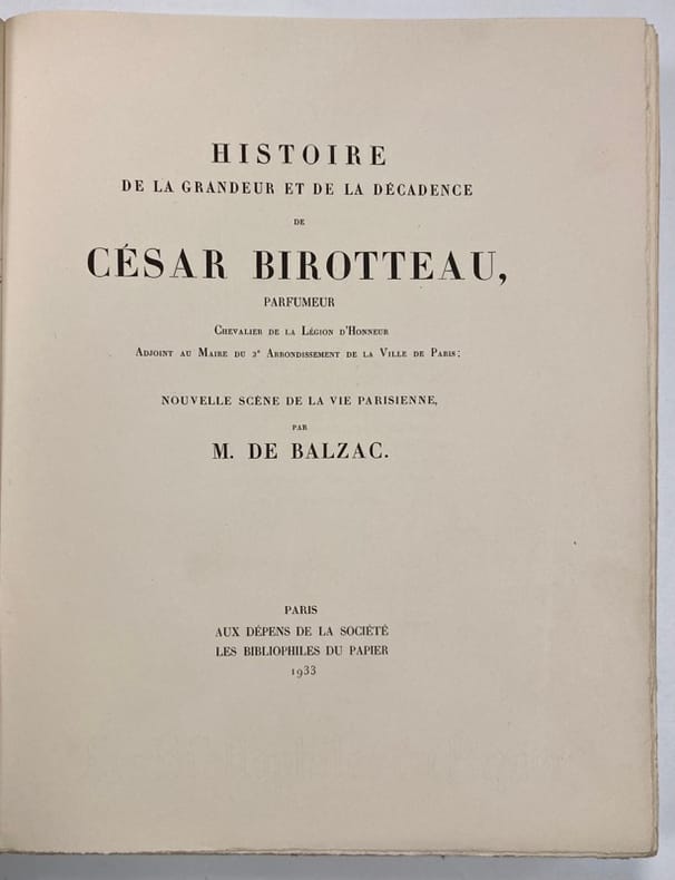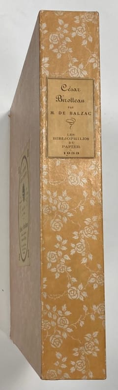 Paris, Aux dépens de la Société Les Bibliophiles du Papier, 1933, in-folio, broché sous couverture rempliée, étui et emboitage à décor de roses, vignette de titre. Etui insolé. Manques de papier au dos de l'emboitage sinon bel exemplaire, très frais. (330x260mm)., 409 pages. 7° volume de la collection des Bibliophiles du Papier. Tirage limité à 110 ex. nominatifs sur Johannot, celui-ci n°8 (M. Porcher). Nombreuses lithographies en noir dans le texte par Lucien Jonas. In fine Notice sur le manuscrit et les épreuves de César Birotteau & Documents divers reproduits en fac-similé : portraits, autographes, épreuves, couvertures. Complet du feuillet libre de 4 pages comprenant le Catalogue des divers produits fabriqués par César Birotteau , du Menu du Dîner en l'honneur de César Birotteau et du Conseils aux Dames ou Essai sur les moyens qu'elles doivent employer pour conserver longtemps leurs attraits . Signatures mauscrites de 24 membres du Club des Bibliophiles sur le dernier feuillet. Complet du courrier annonçant au souscripteur la mise à disposition de son exemplaire sous enveloppe illustrée.