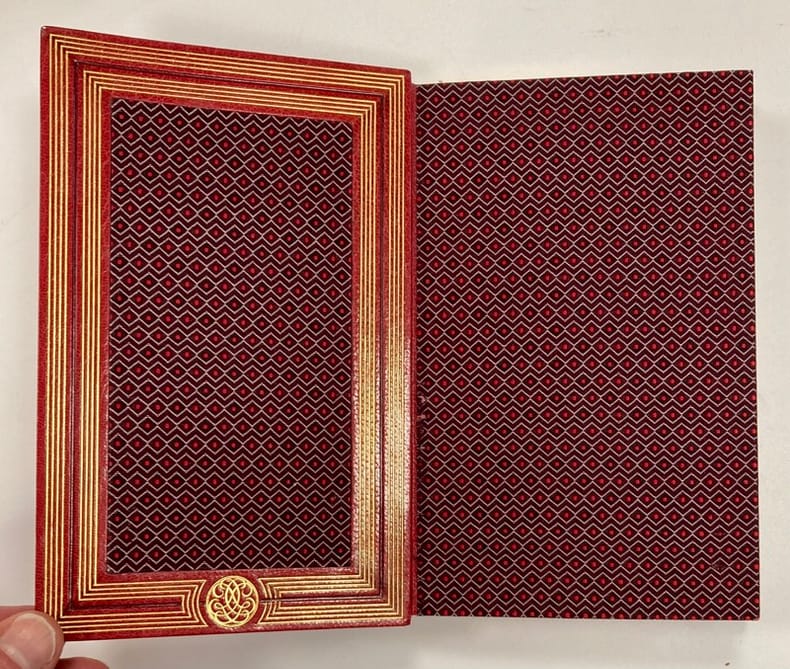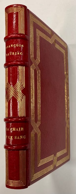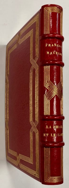 1920 Paris. Emile-Paul frères. 1920. 1 volume in-12 à grandes marges, plein maroquin rouge, double bande de 5 filets dorés entremêlés en encadrement sur les plats et sur le dos à nerfs, tranches dorées, bordure intérieure ornée d’un chiffre doré et d’une double bande de 5 filets dorés et d’1 filet à froid en encadrement, doublure et garde de soie gaufrée bordeaux et blanc semée de pointillés rouges, couvertures et dos conservés, étui, reliure signée G. Mercier, succ. De son père. (3) ff. ; 280 pp.