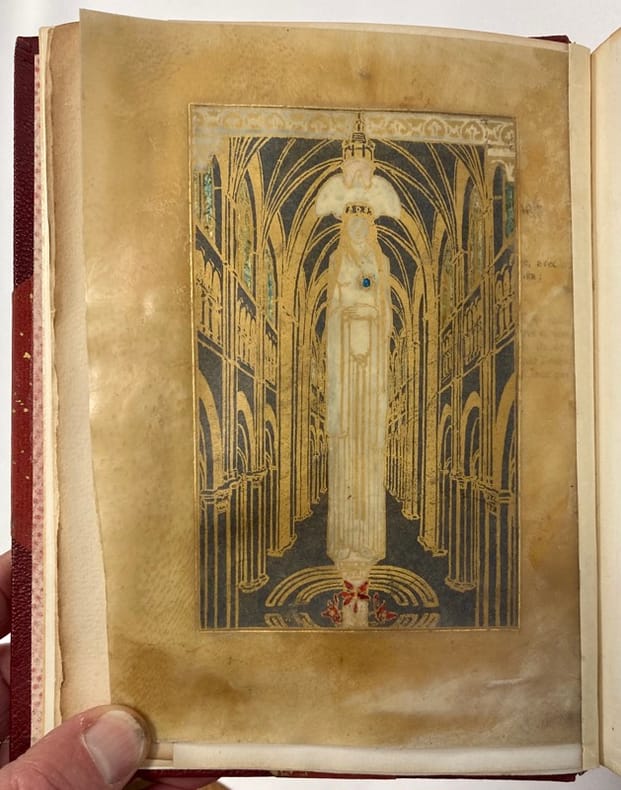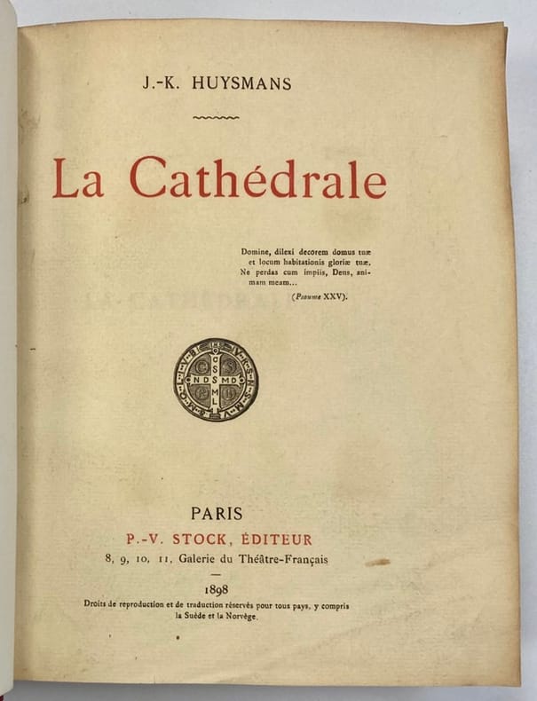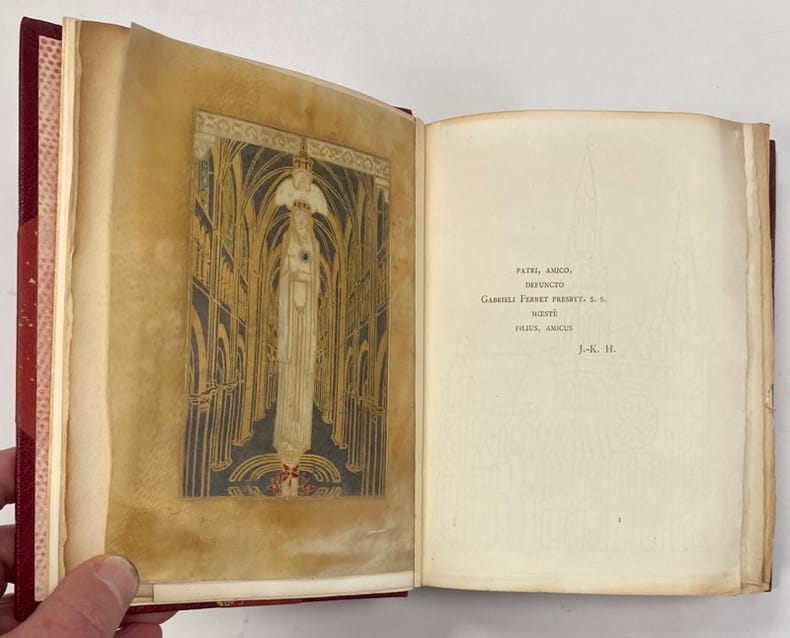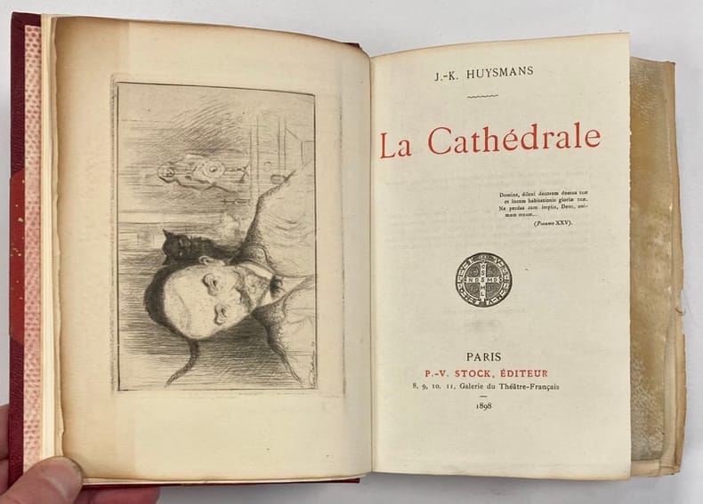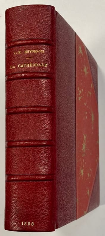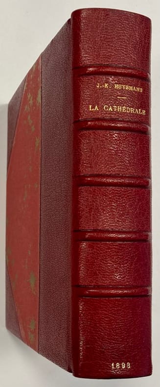 Edition originale ornée d’1 frontispice en couleurs rehaussé d’or de Pierre Roche, gravé sur parchemin églomisé, et d’1 portrait frontispice par Eugène Delâtre. 1 des 100 exemplaires numérotés sur Vergé de Hollande portant en filigrane la cathédrale de Chartres dessinée par Louis Chevalier.La Cathédrale de Huysmans marque l’aboutissement de la conversion spirituelle de l’écrivain. L’œuvre offre une description extraordinairement détaillée de la cathédrale de Chartres, devenue presque un personnage à part entière. Ce livre a joué un rôle majeur dans le renouveau de l’intérêt pour l’art gothique et la pensée chrétienne au tournant du XIX siècle.Ex-libris André Chrétien.