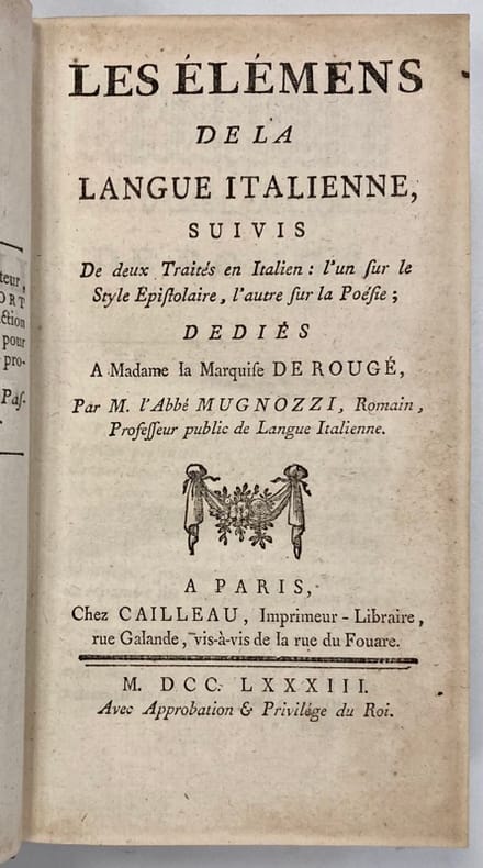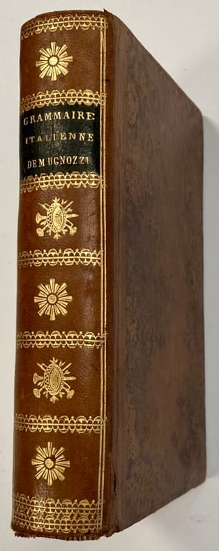 Manuel complet de grammaire, conjugaison ou encore vocabulaire de langue italienne selon la méthode du professeur public Mugnozzi.Petit manque aux coiffes. Petit trou de vers en bas de la charnière supérieure. Déchirure sans manque p.216.