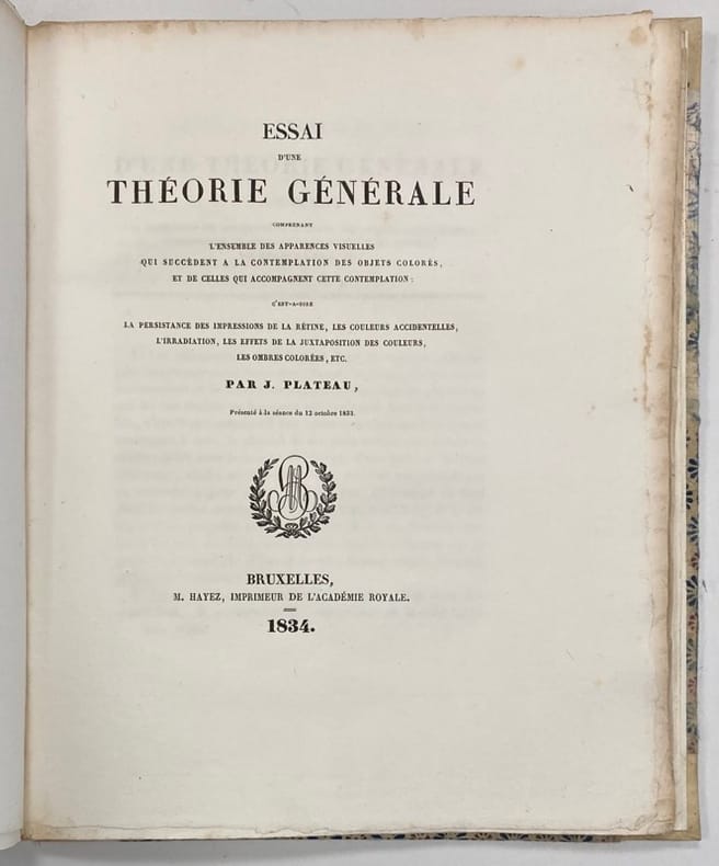 …c’est à dire des impressions de la rétine, les couleurs accidentelles, l’irradiation, les effets de la juxtaposition des couleurs, les ombres colorées, etc…Rare et important mémoire du mathématicien et physicien Joseph Plateau présenté le 12 octobre 1833 à l’Académie des sciences sur l’impression et la persistance rétinienne des couleurs. Il reprend l’ensemble des théories existantes sur le sujet (Darwin, Newton, Buffon, Biot, Brewster…), et les met en lien pour en faire une synthèse tout à fait inédite: Lorsque la rétine perçoit un objet de couleur, son ajustement et son accommodation provoquent une persistance des impressions (Darwin) sous la forme de couleurs complémentaires (Newton) appelées « couleurs accidentelles » (Buffon). Puis la rétine revient à son état primitif par un système d’oscillations que Plateau schématise in fine sur la planche dépliante.Il finit son étude en généralisant ce principe à toute perception de l’organisme à un stimulus prolongé comme le froid, la douleur ou même la joie.Cachet « Bibliothèque Lovarii ». Quelques rousseurs et trace d'humidité sur les derniers feuillets.